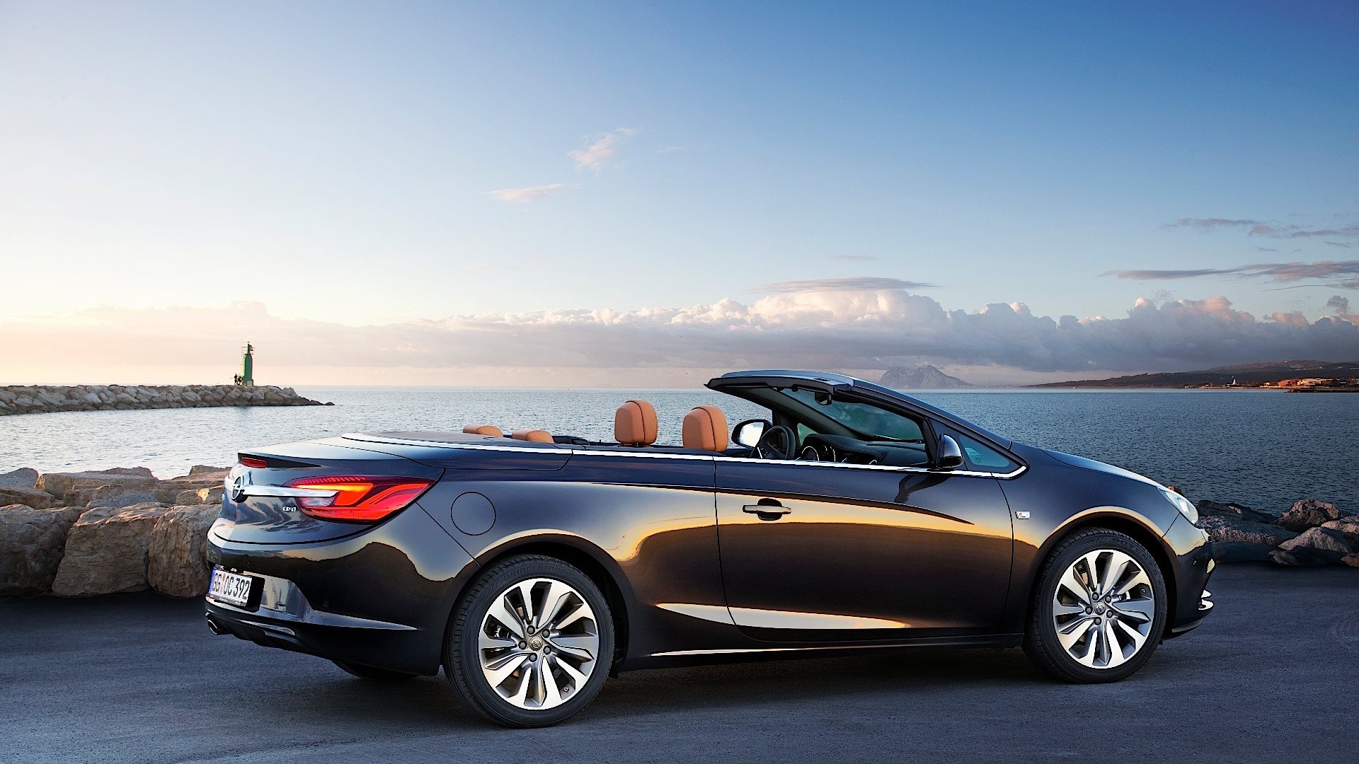 Description: A car parked near the water with a sky background and a lighthouse in the distance with a blue sky.