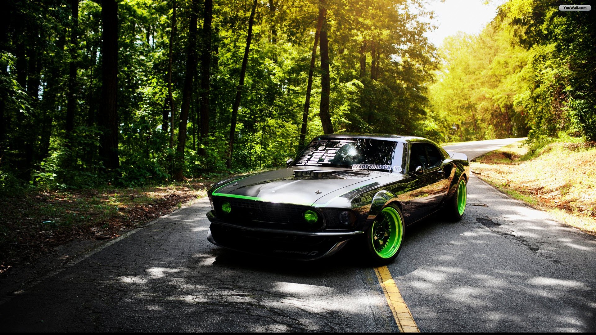 Description: A car parked on the side of a road in the woods with green rims and a hood on.
