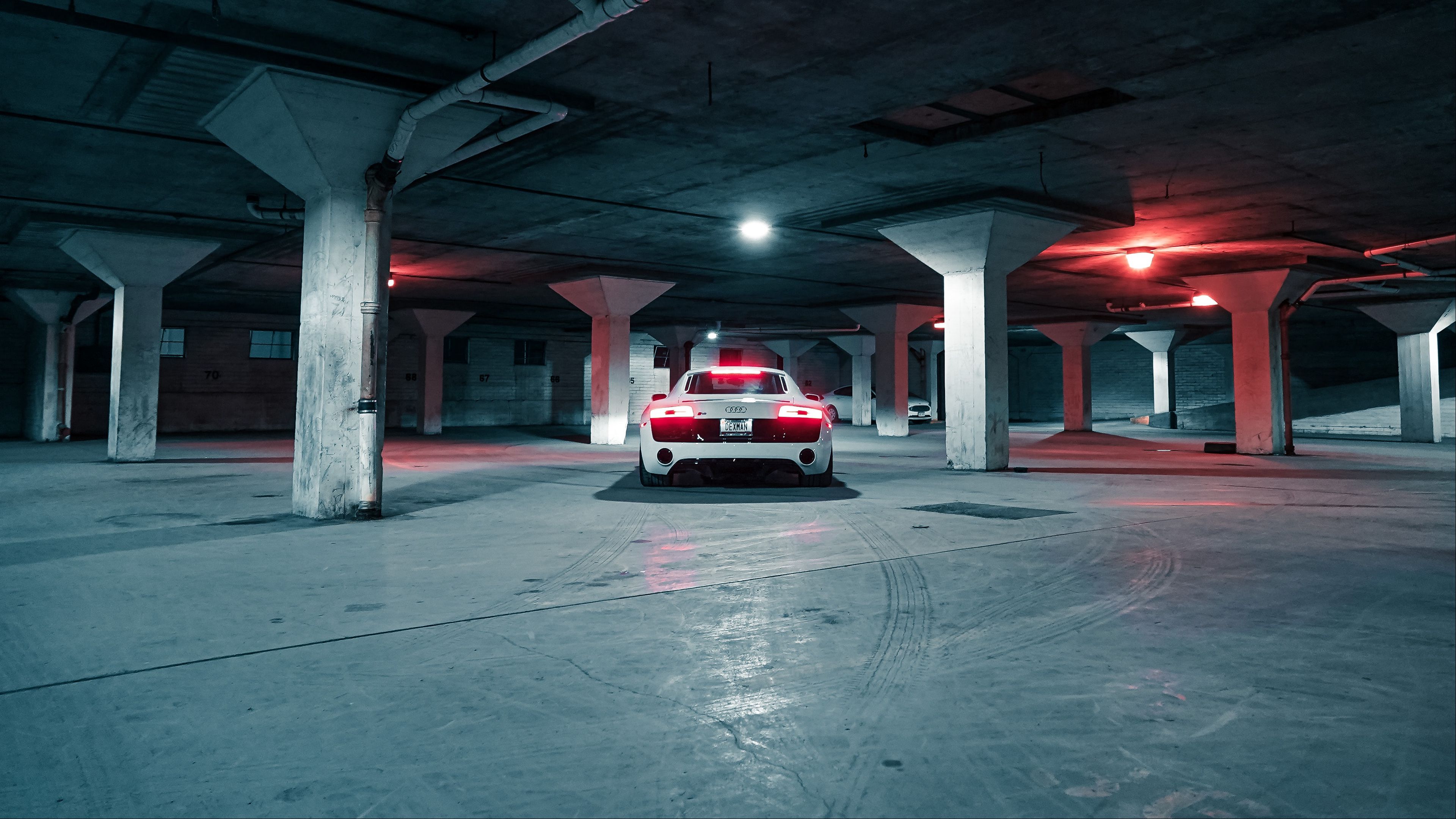 Description: A car parked in a parking garage with red lights on the roof and a white car in the middle.