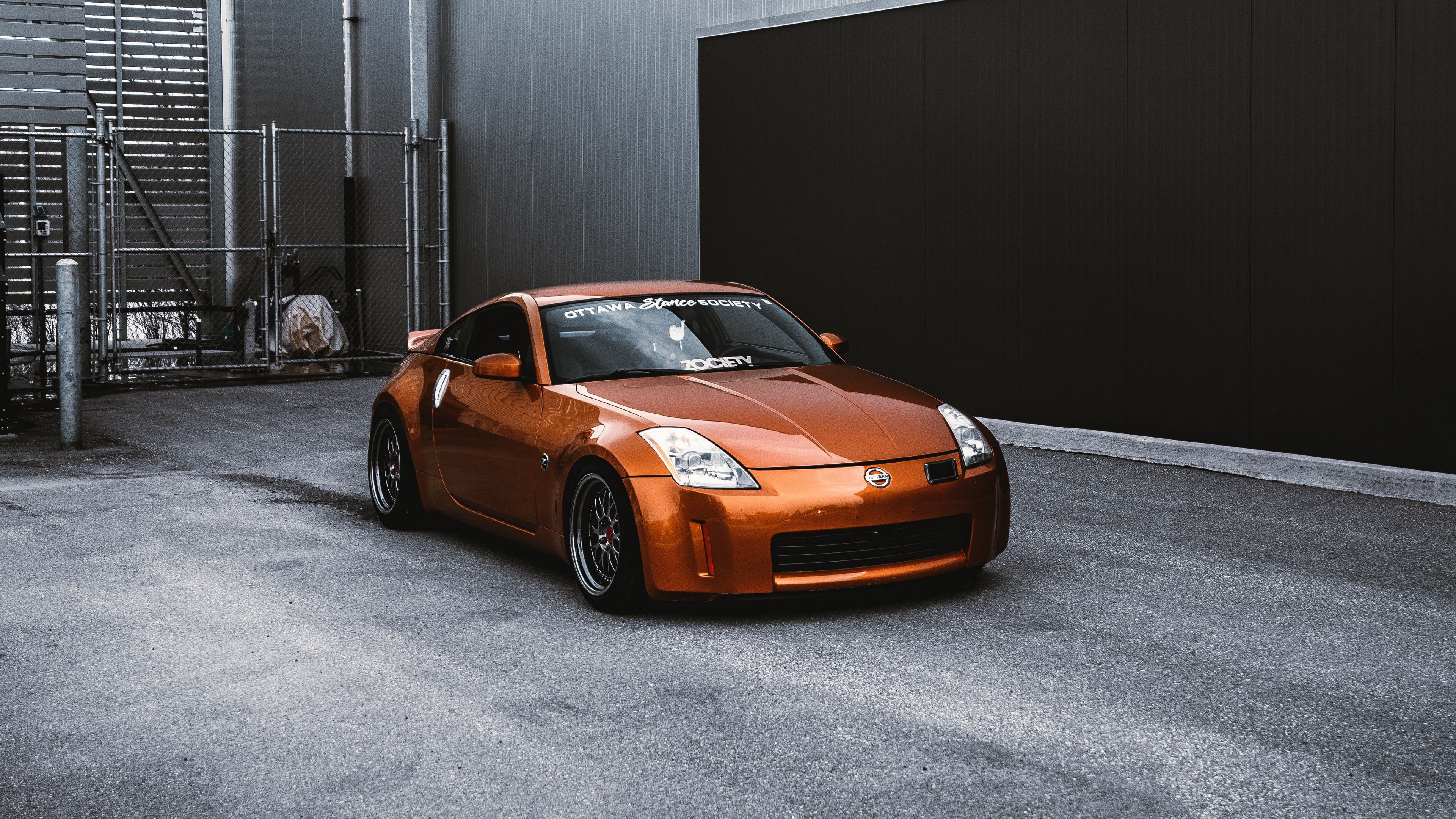Description: A car parked in a parking lot next to a building with a large metal structure behind it and a black door.