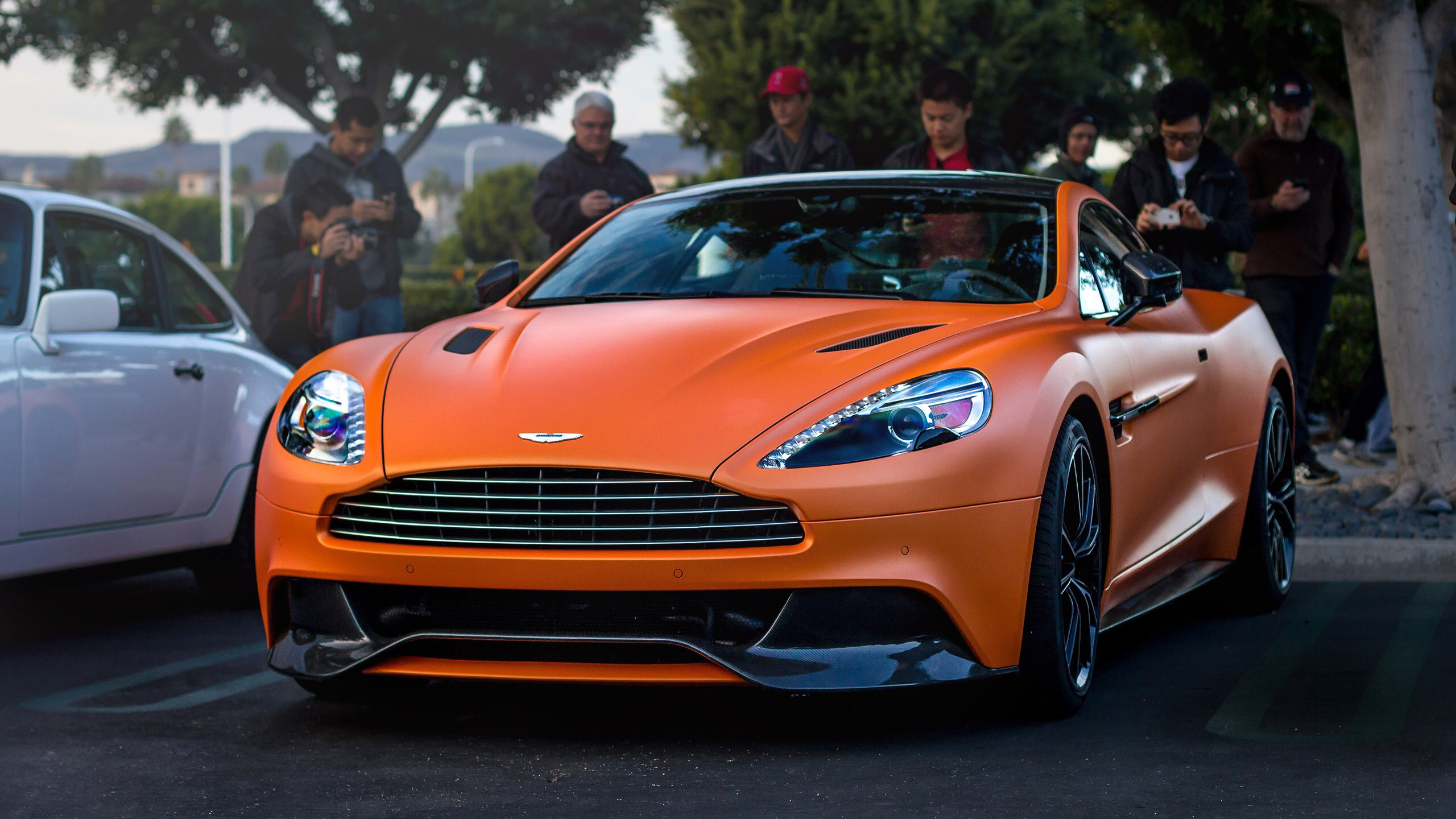 Description: A car is parked in a parking lot with people standing around it and a man standing behind it looking at the car.