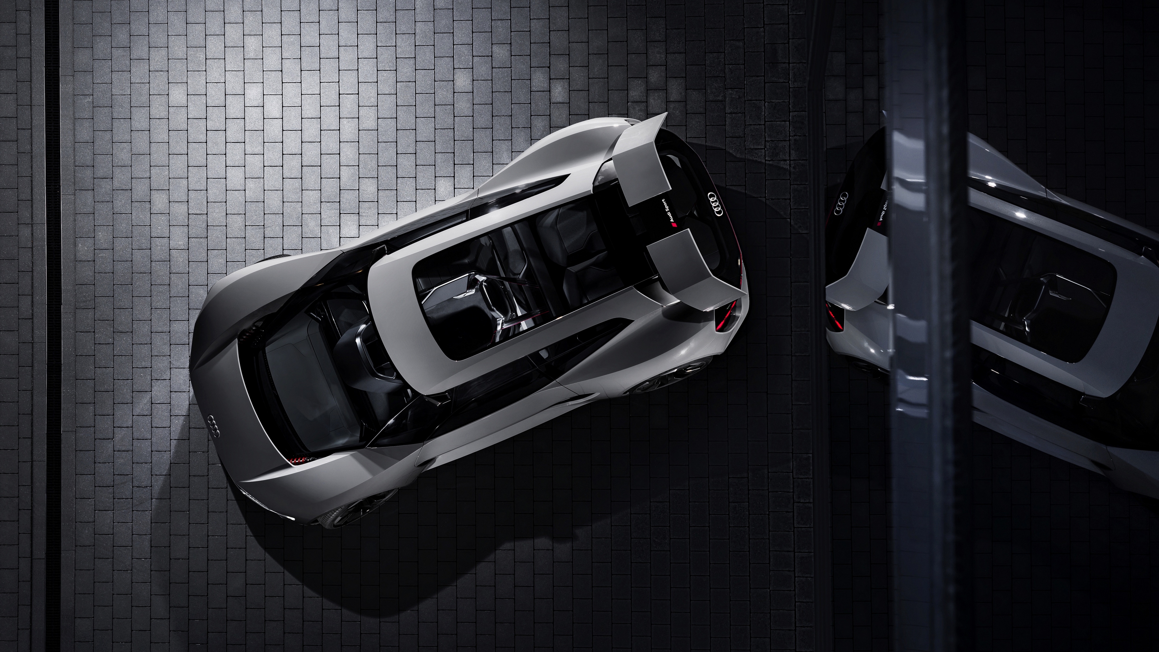 Description: A car is shown from above in a dark room with a door open and a car parked in the middle.