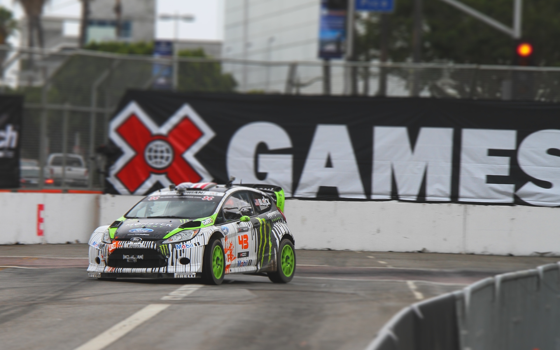 Description: A car driving on a race track with a banner behind it that says games on the side of the road.