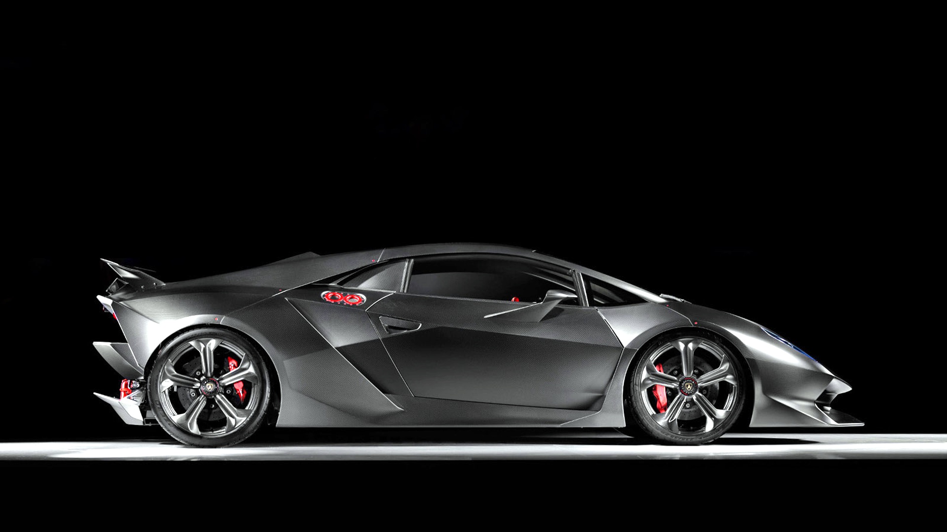 Description: A very nice looking car in a dark room with a black background and a red rim on the front.