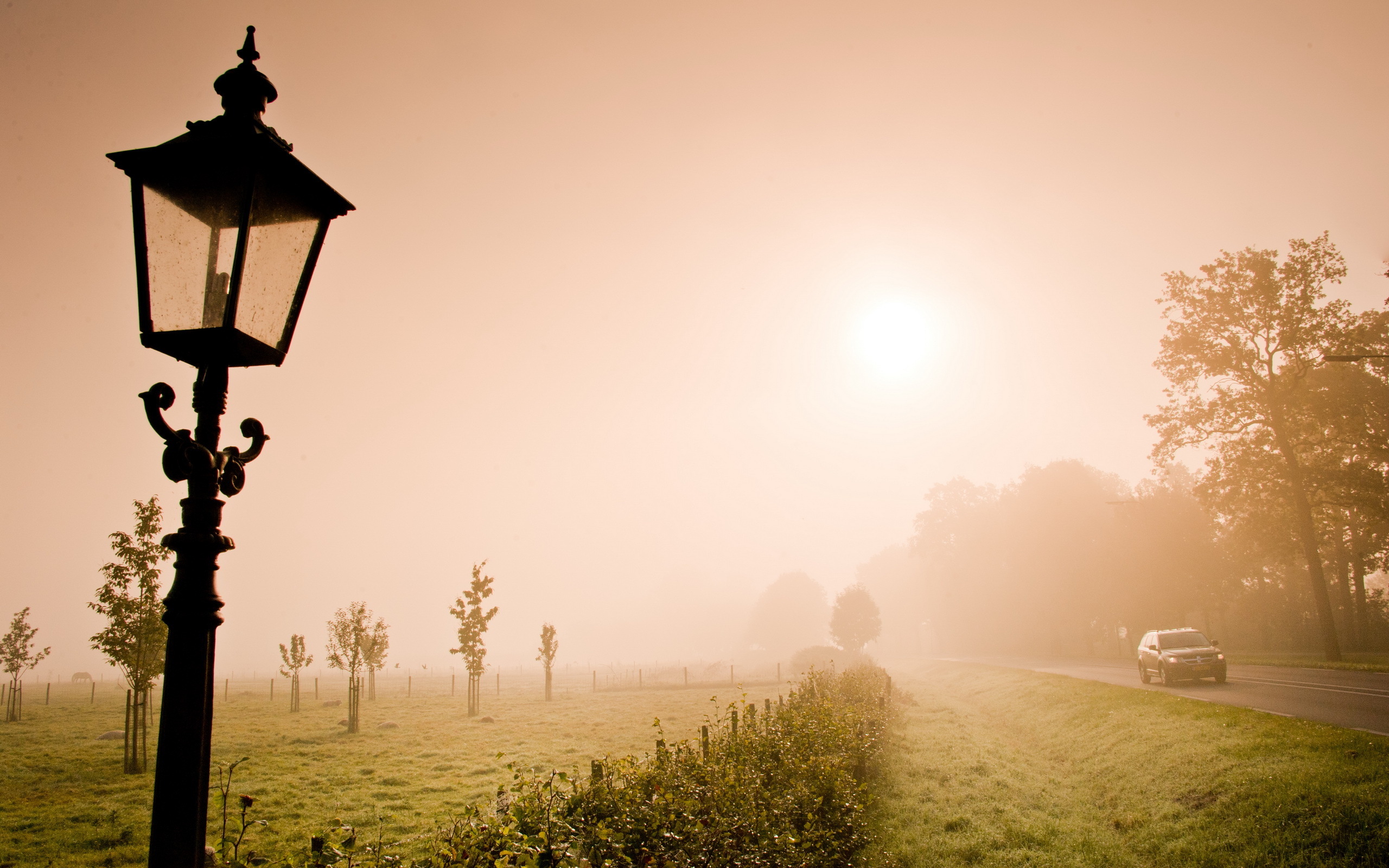 Description: A car driving down a road next to a lamp post and a field with trees on it in the fog.
