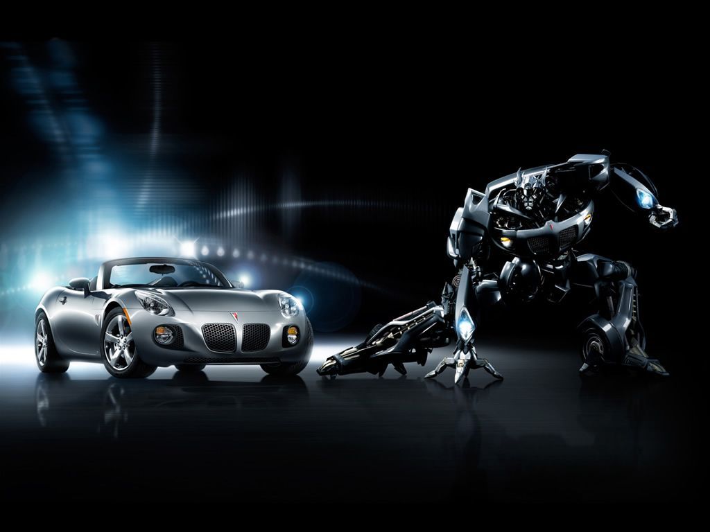 Description: A car and a robot in a dark room with lights on the floor and a car behind it.