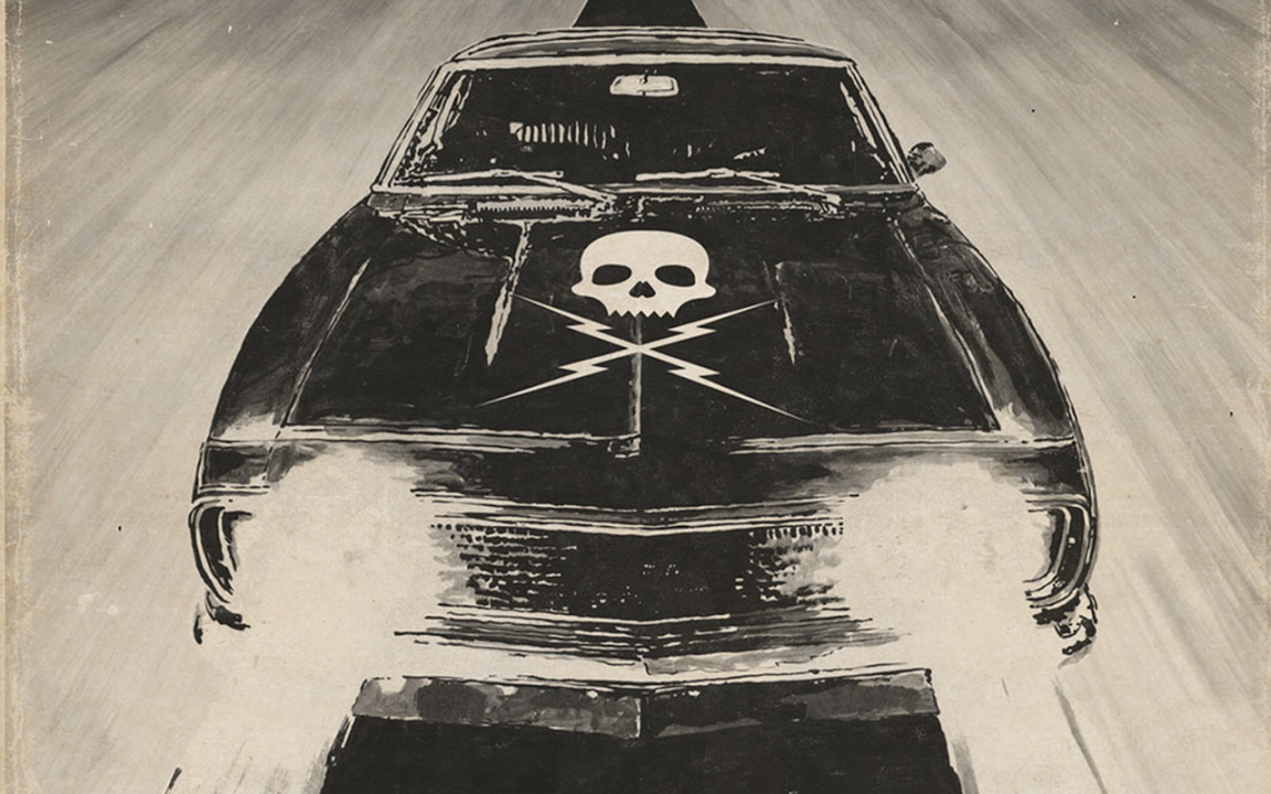 Description: A car with a skull and crossbones on it's hood is shown in a black and white drawing.