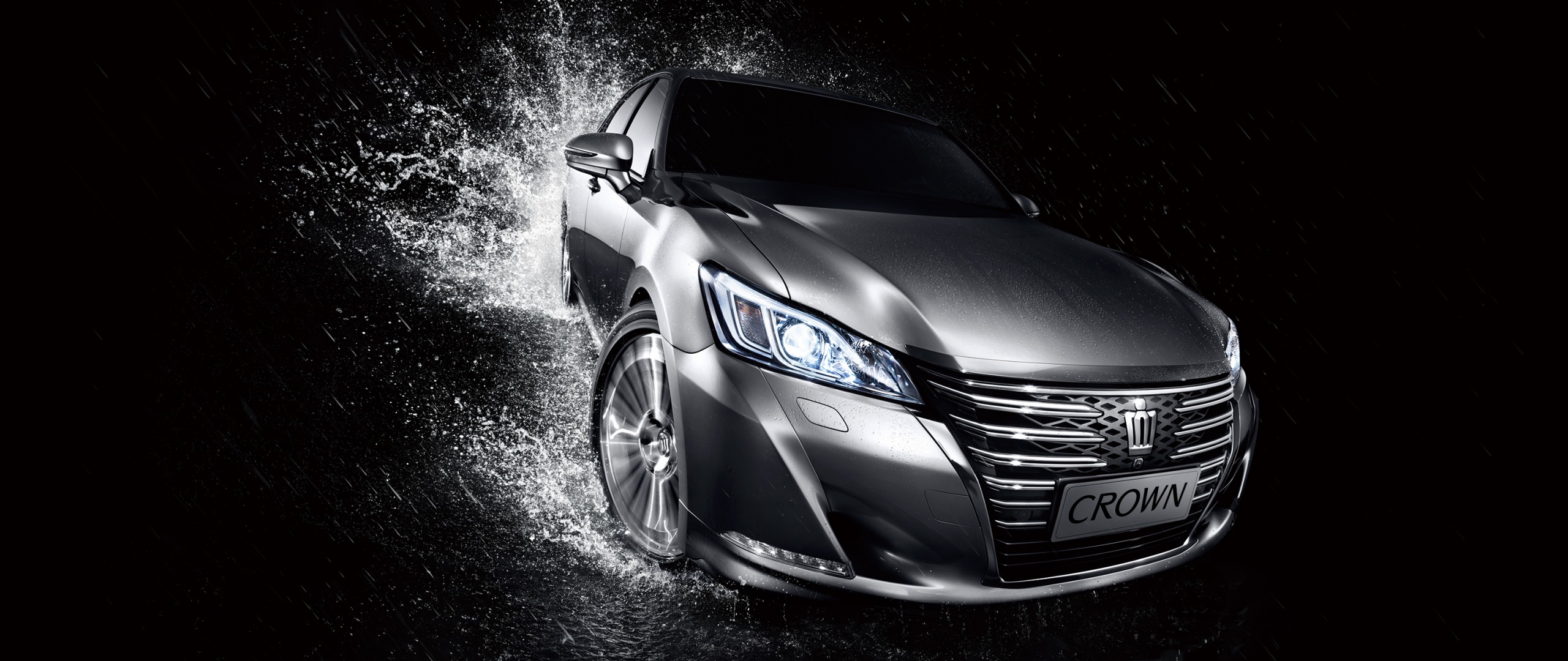 Description: A car is splashing through the water in the dark room with a black background and a white light.