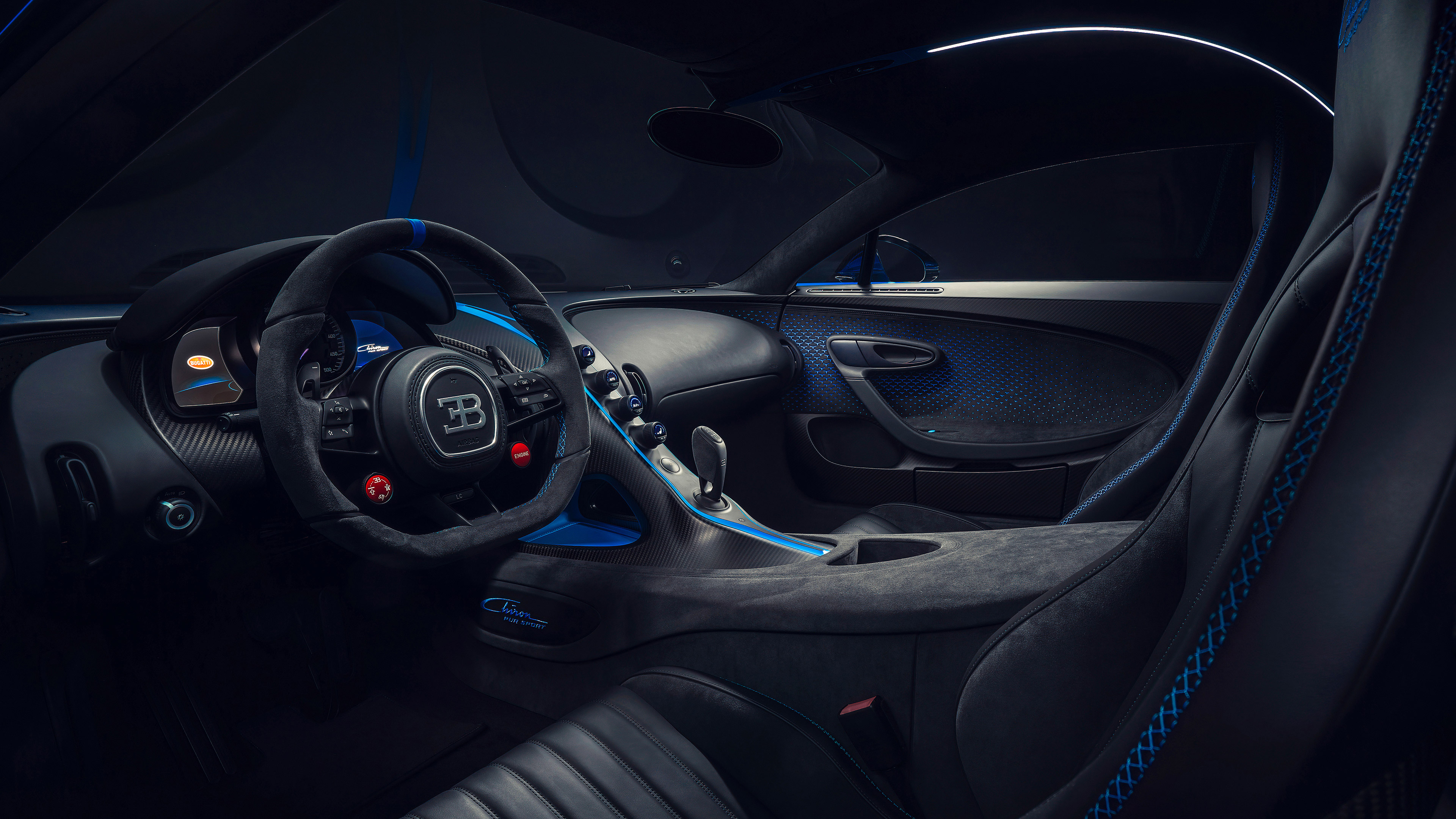 Description: A car with a steering wheel and a blue stitch on the dash line and a black leather interior and a blue stitch on the dash line.