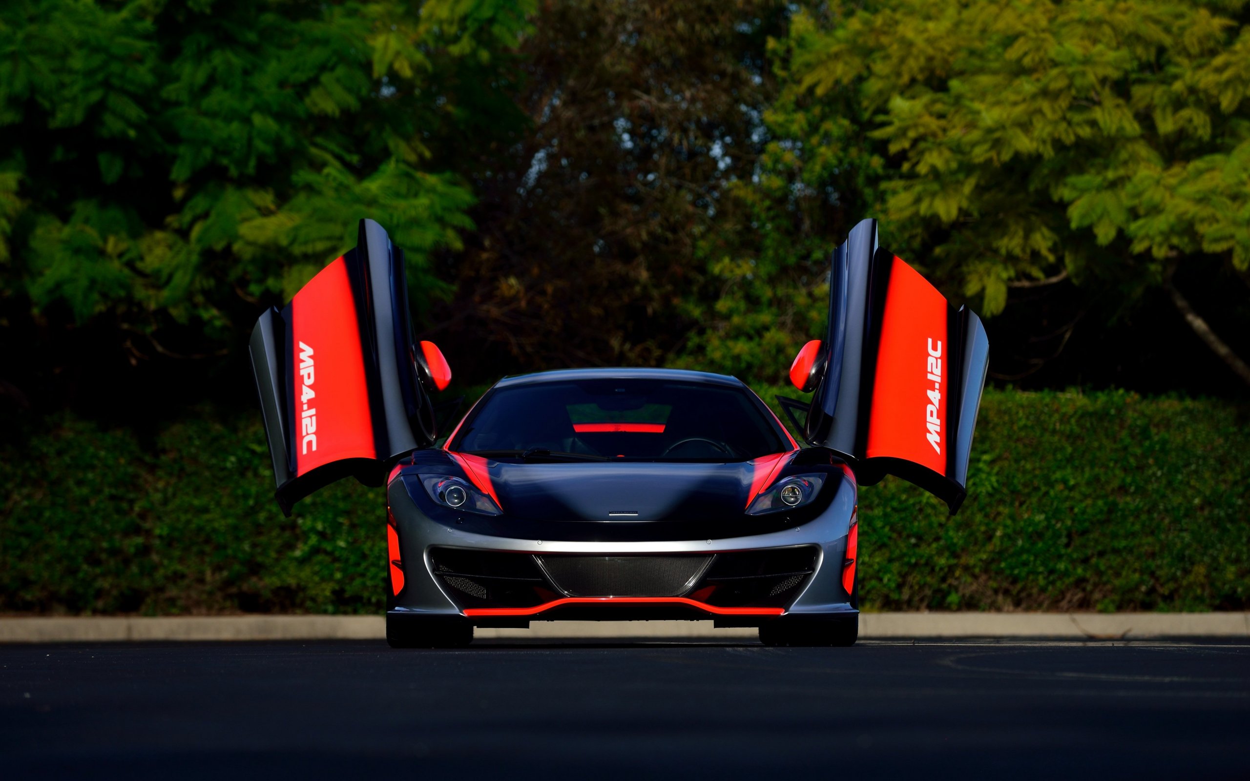 Description: A car with its doors open on a street with trees in the background and bushes in the foreground.