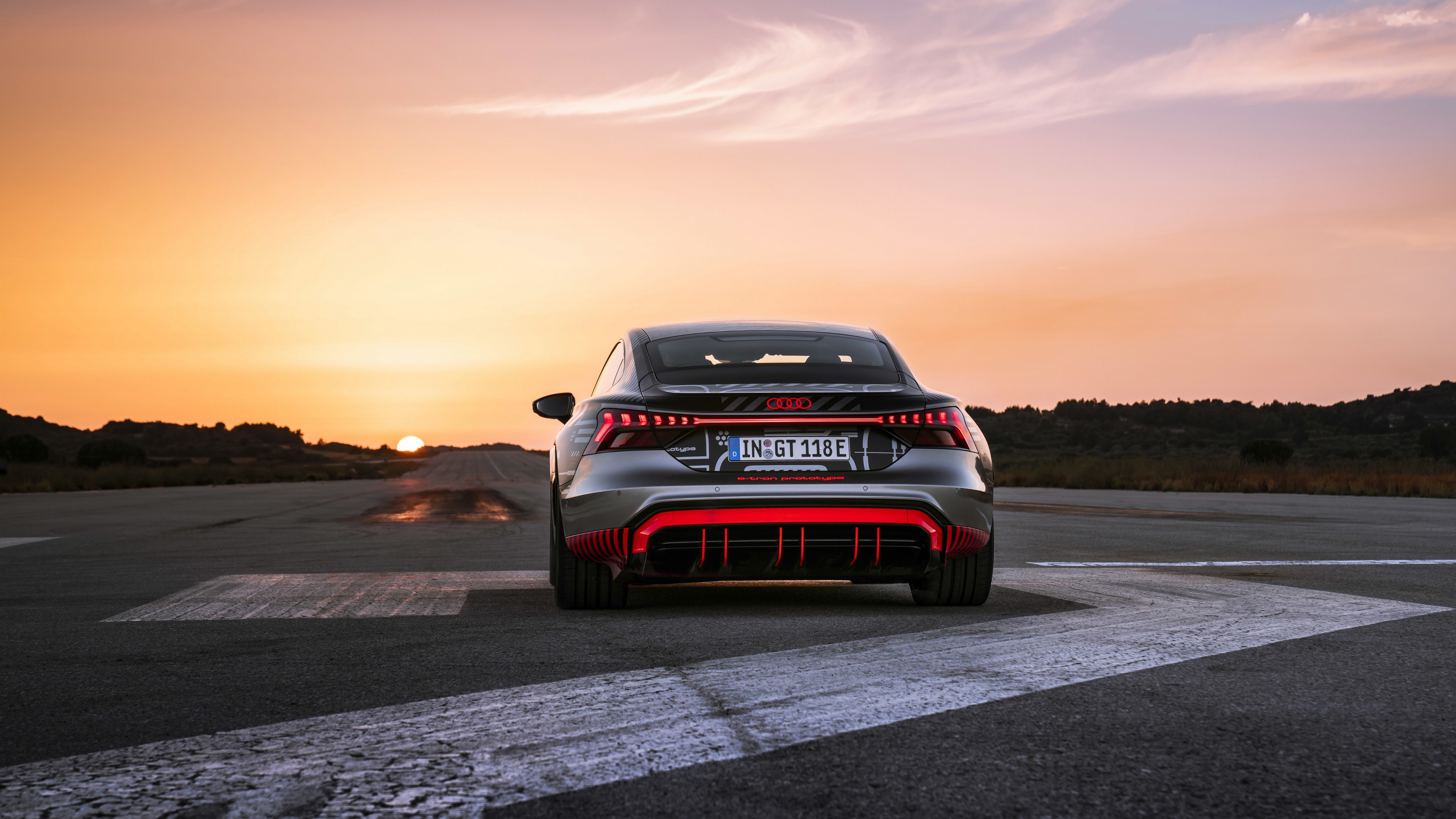 Description: A car driving on a road with the sun setting in the background and clouds in the sky above it.