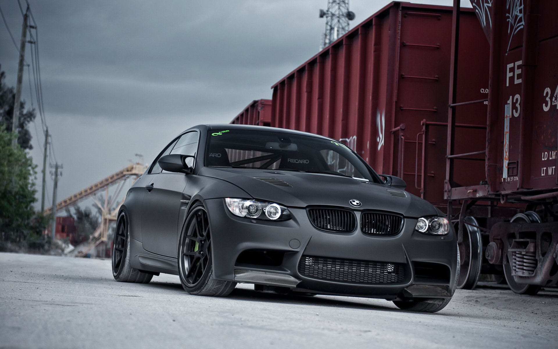 Description: A car parked next to a train on a track with a red train car in the background and a red train car in the foreground.