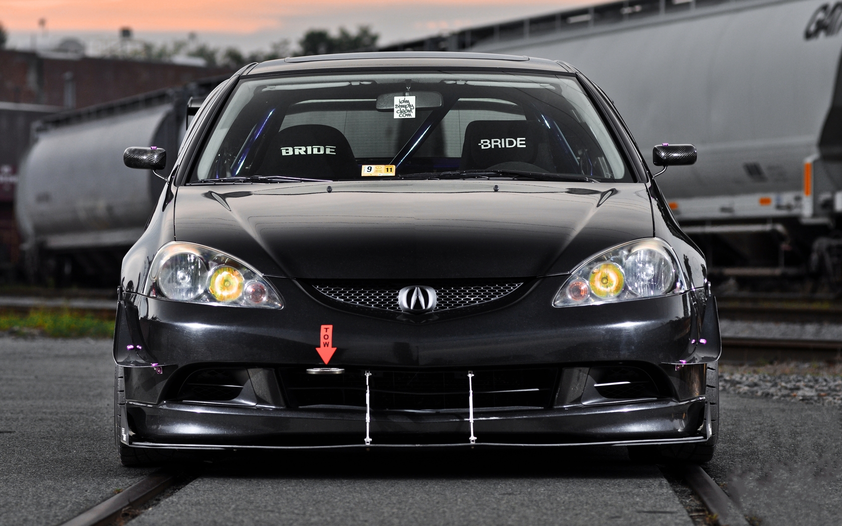 Description: A car parked on the side of a train track with a train in the background and a train on the track.