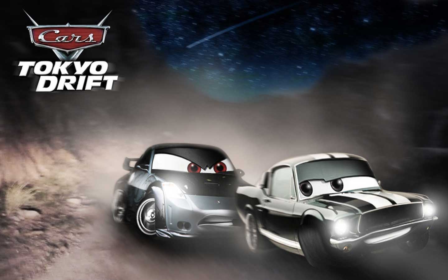Description: A car and truck driving in the dark with a sky background and stars above them.