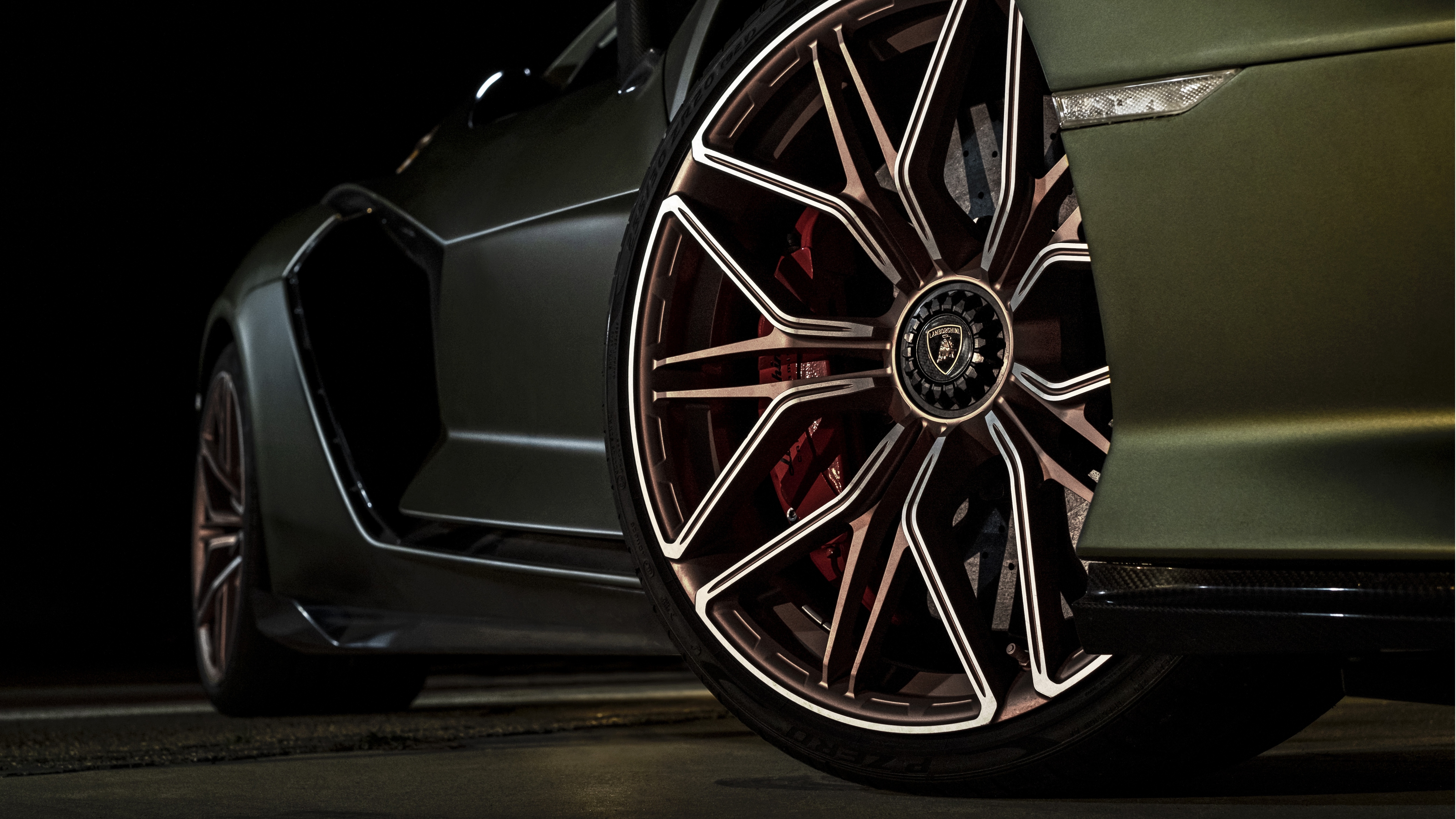 Description: A close up of a car wheel on a car in a dark room with a black background and a black background.