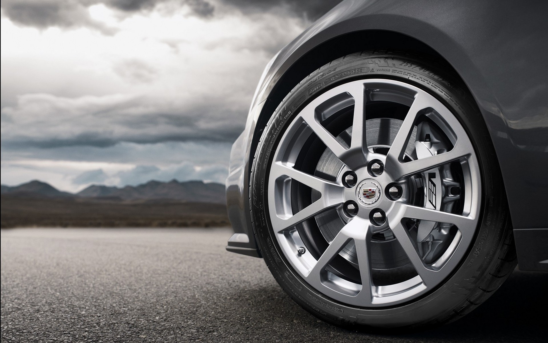 Description: A car wheel on a road with mountains in the background and clouds in the sky above it.