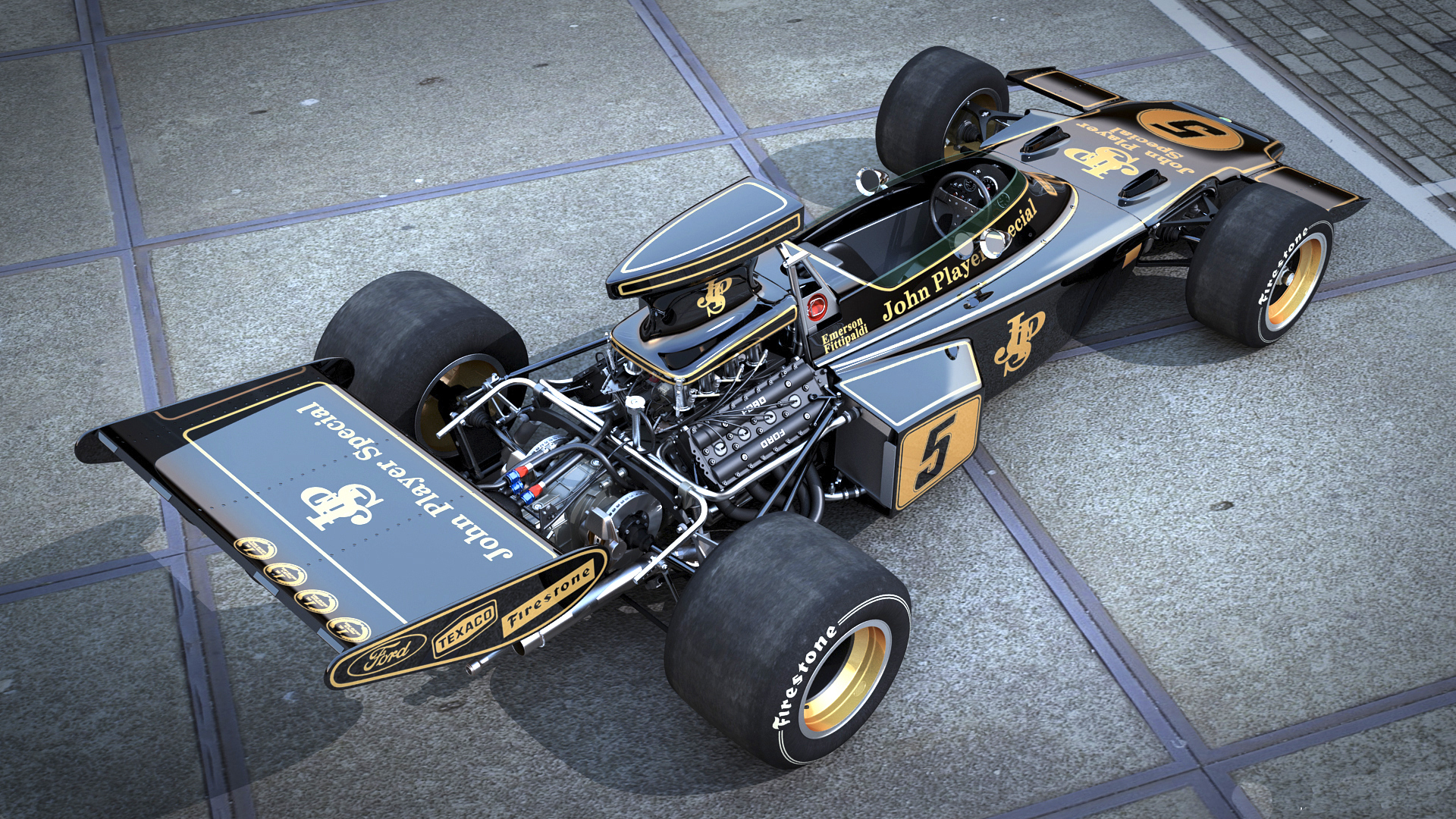 Description: A car with a yellow and black front wheel drive on a tile floor with a sign on the side of it.