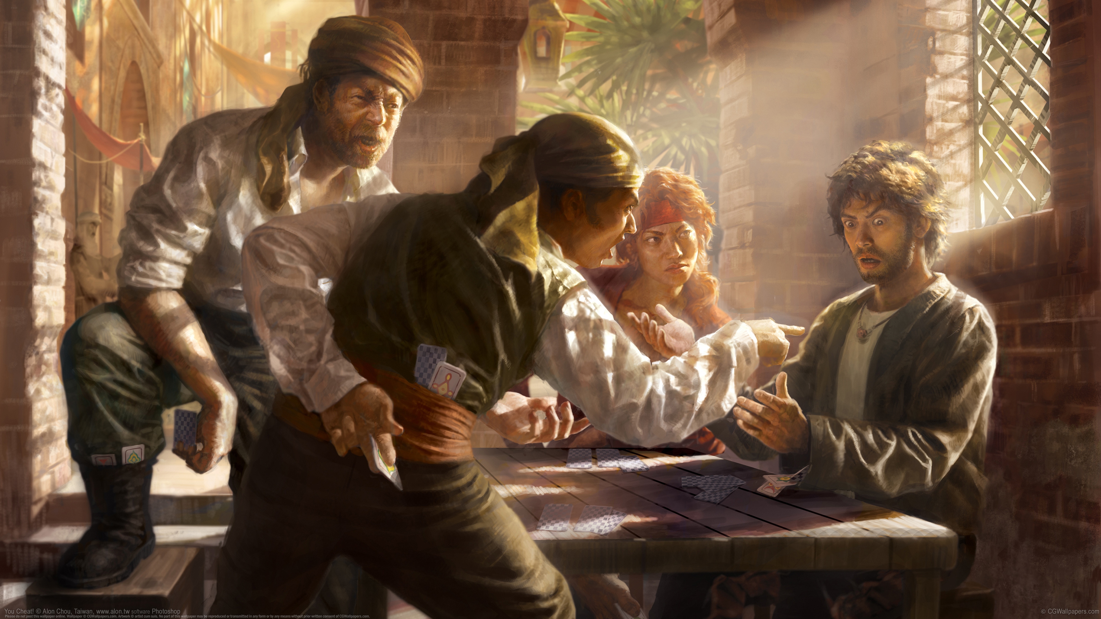 Description: A painting of a group of people playing cards at a table with a brick wall in the background and a man in a white shirt and tie.