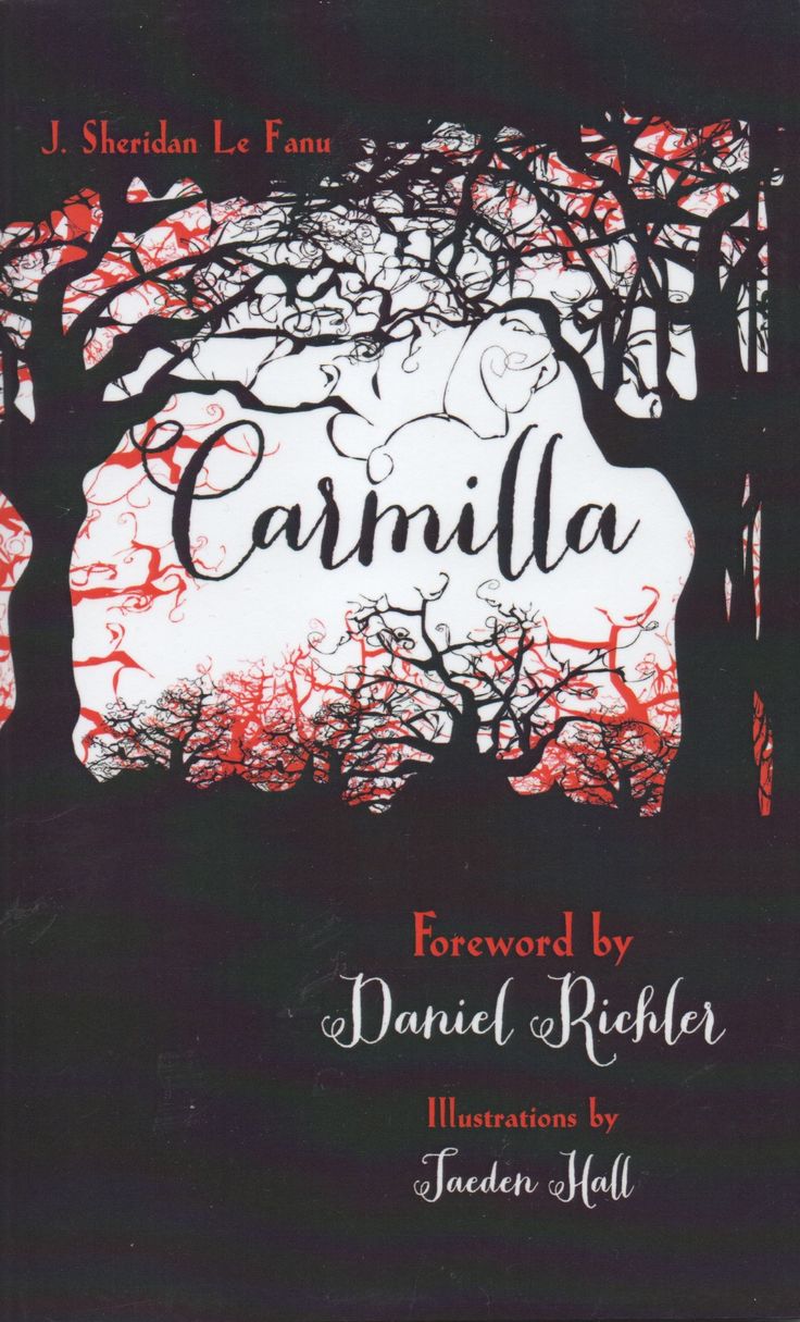 Description: A book cover with a picture of trees and a red sky in the background with the words carmilla.