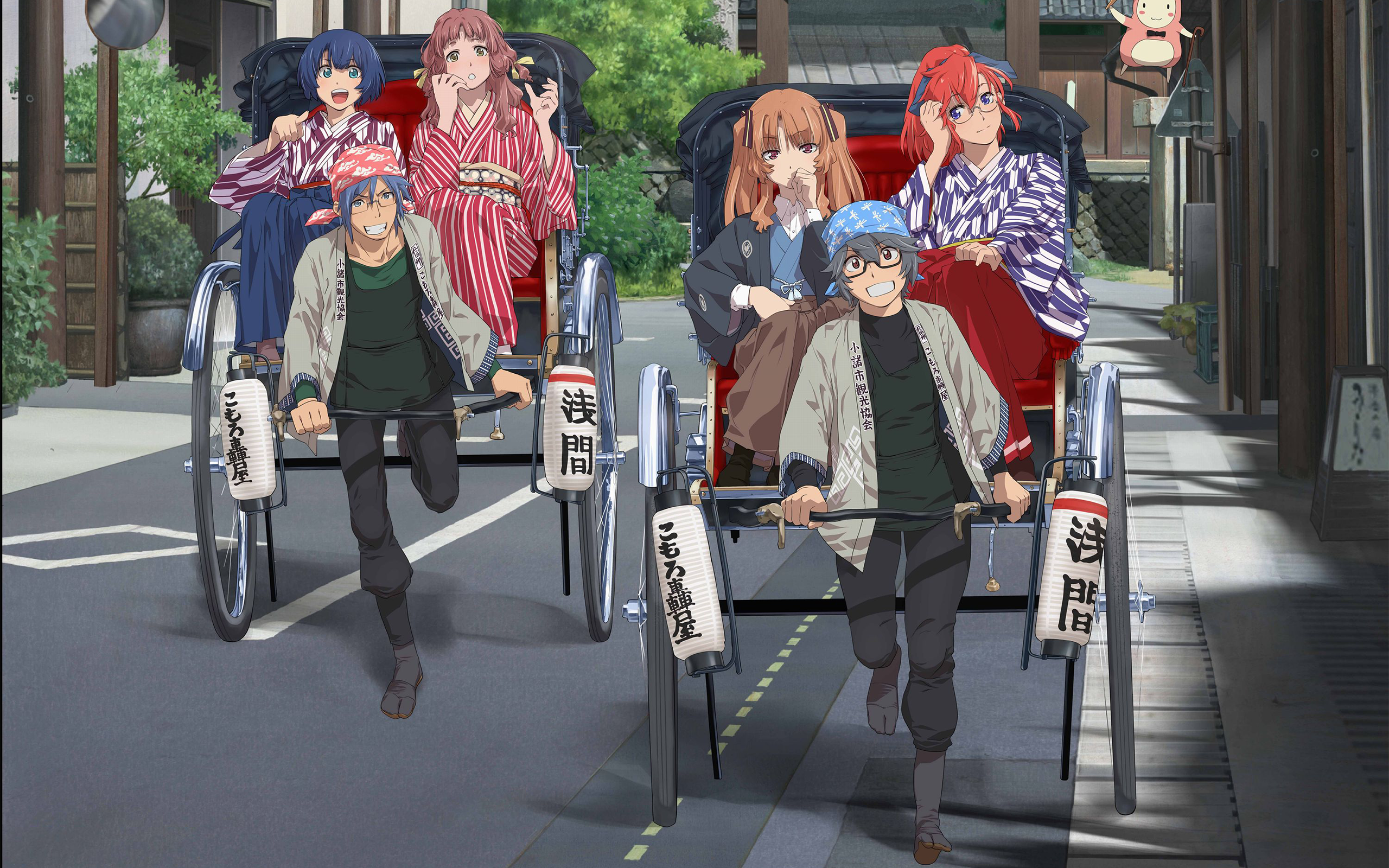 Description: A group of people riding on a carriage down a street in front of a building with a sign on it.