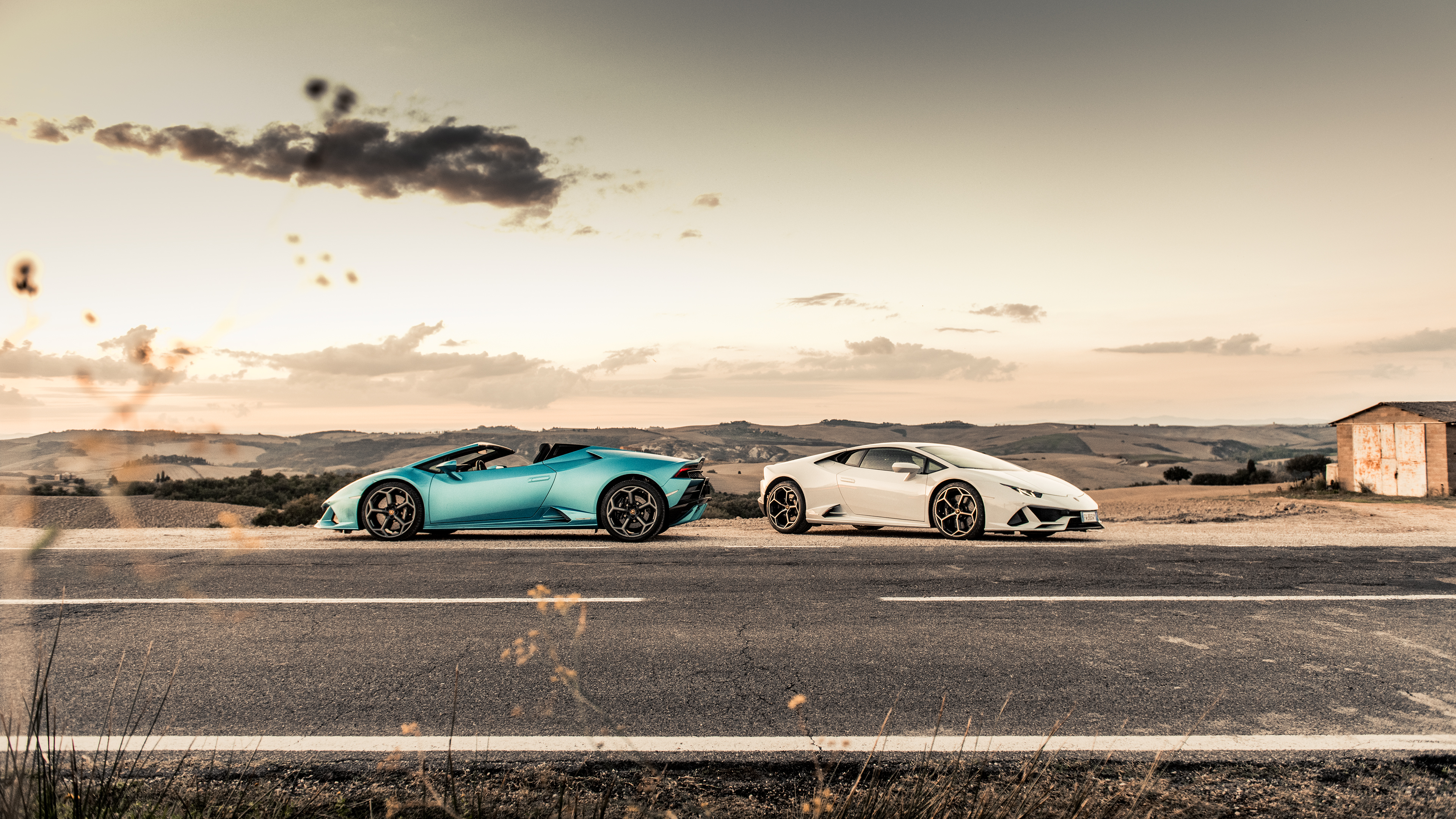 Description: Two cars parked on the side of the road near a building and a field with grass and bushes in front of them.
