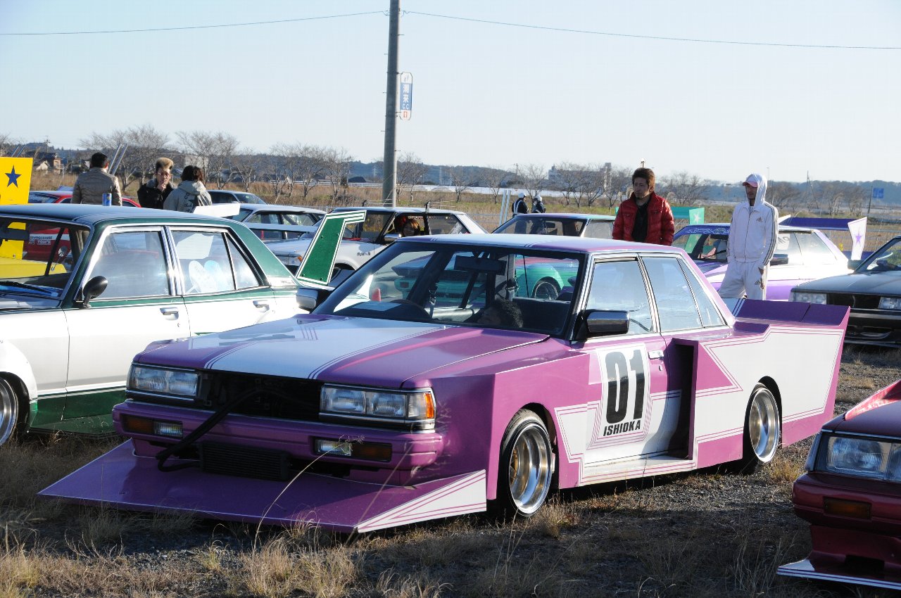Description: A group of cars parked in a field with people standing around them and a man standing on the car.