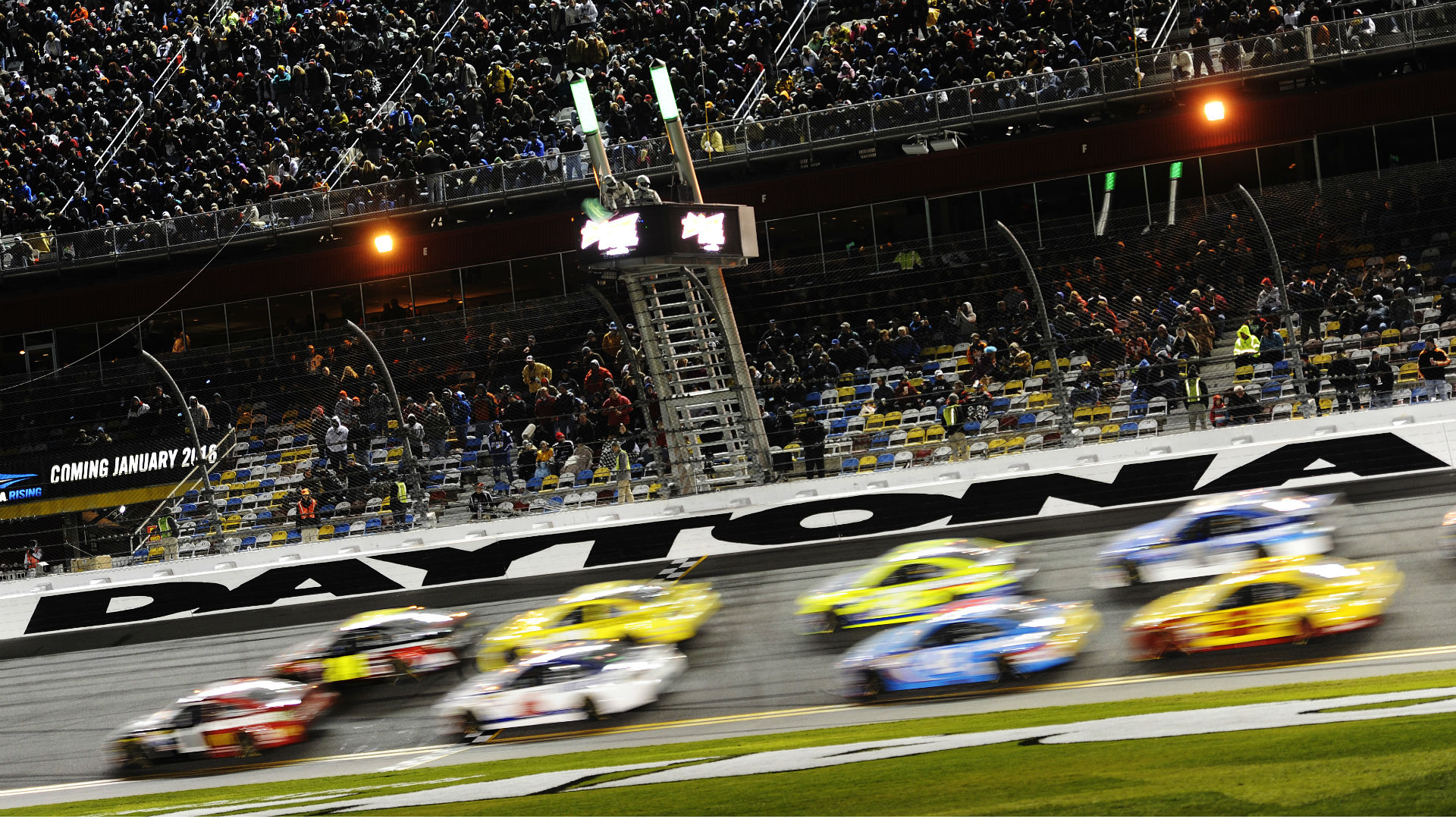 Description: A group of cars racing on a track in front of a crowd of people in a stadium full of people.
