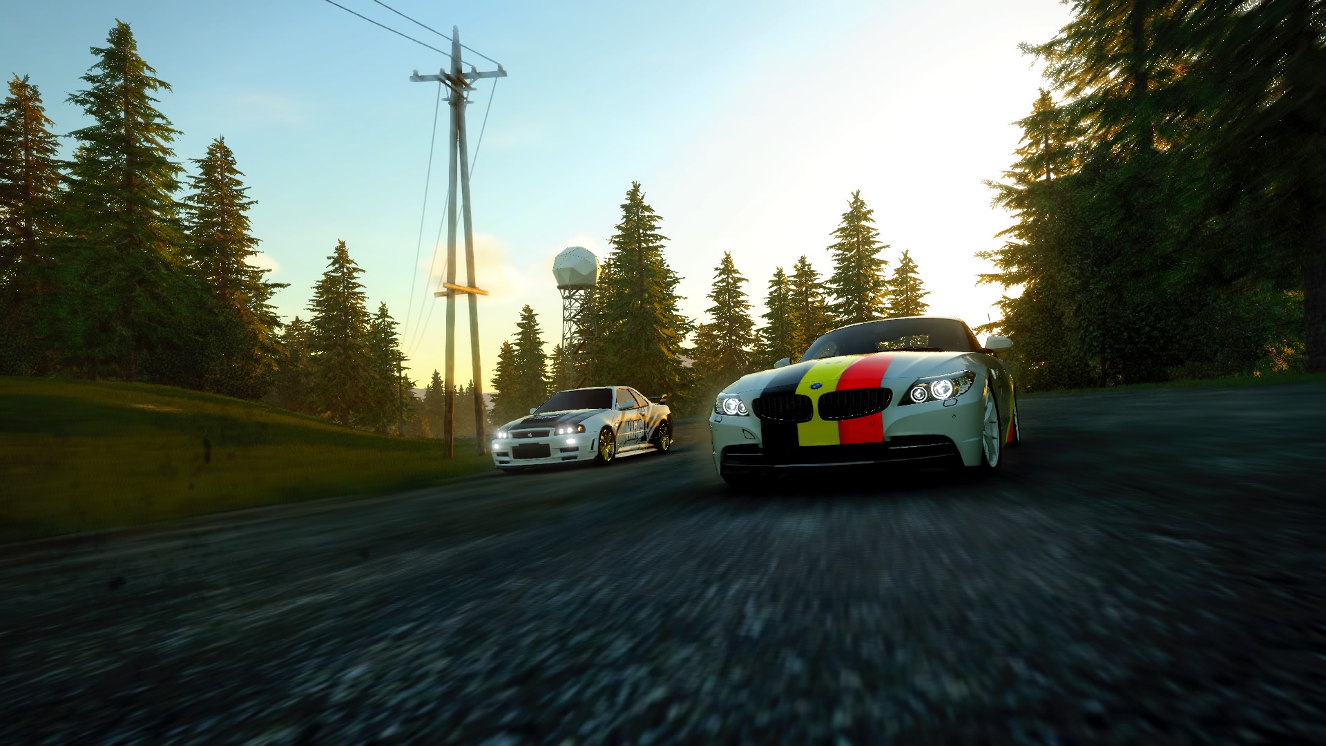 Description: Two cars driving down a road with trees in the background and a radio tower in the distance in the distance.