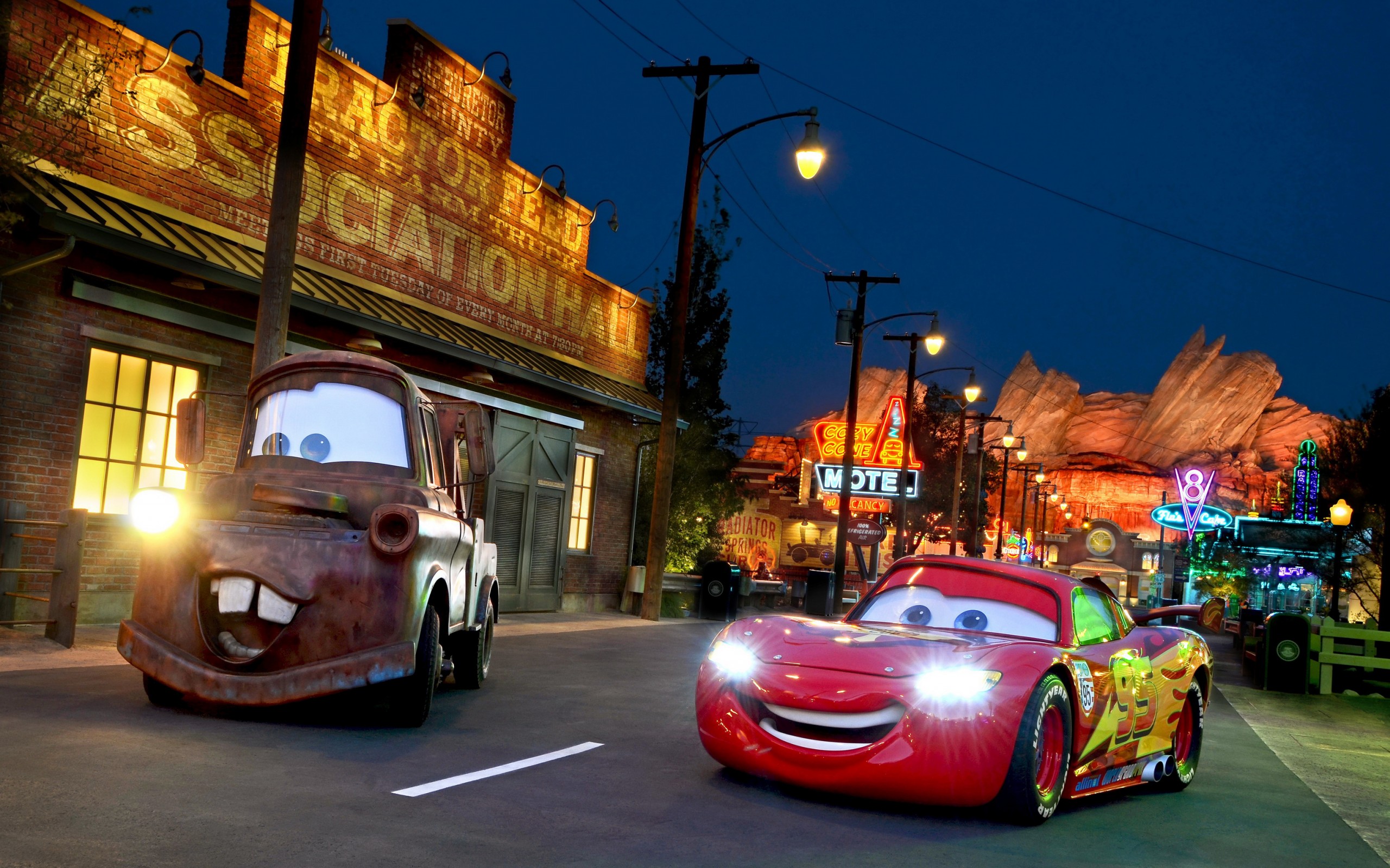 Description: Cars driving down a street at night with a building in the background and a sign for a movie theater.