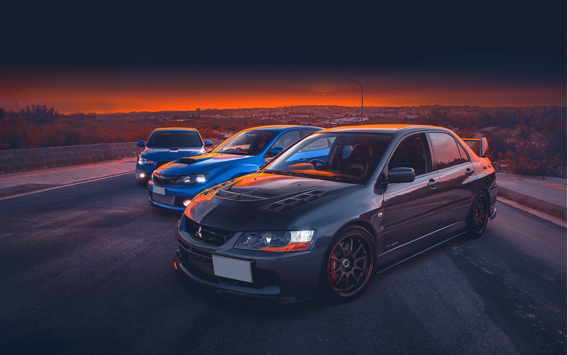 Description: A group of cars parked on the side of a road at night time with the sun setting behind them.