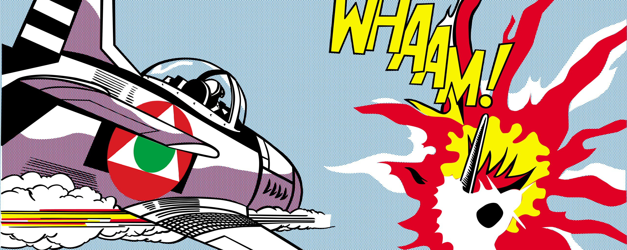 Description: A cartoon airplane with a red and yellow flame coming out of it's nose and the words wham on it.
