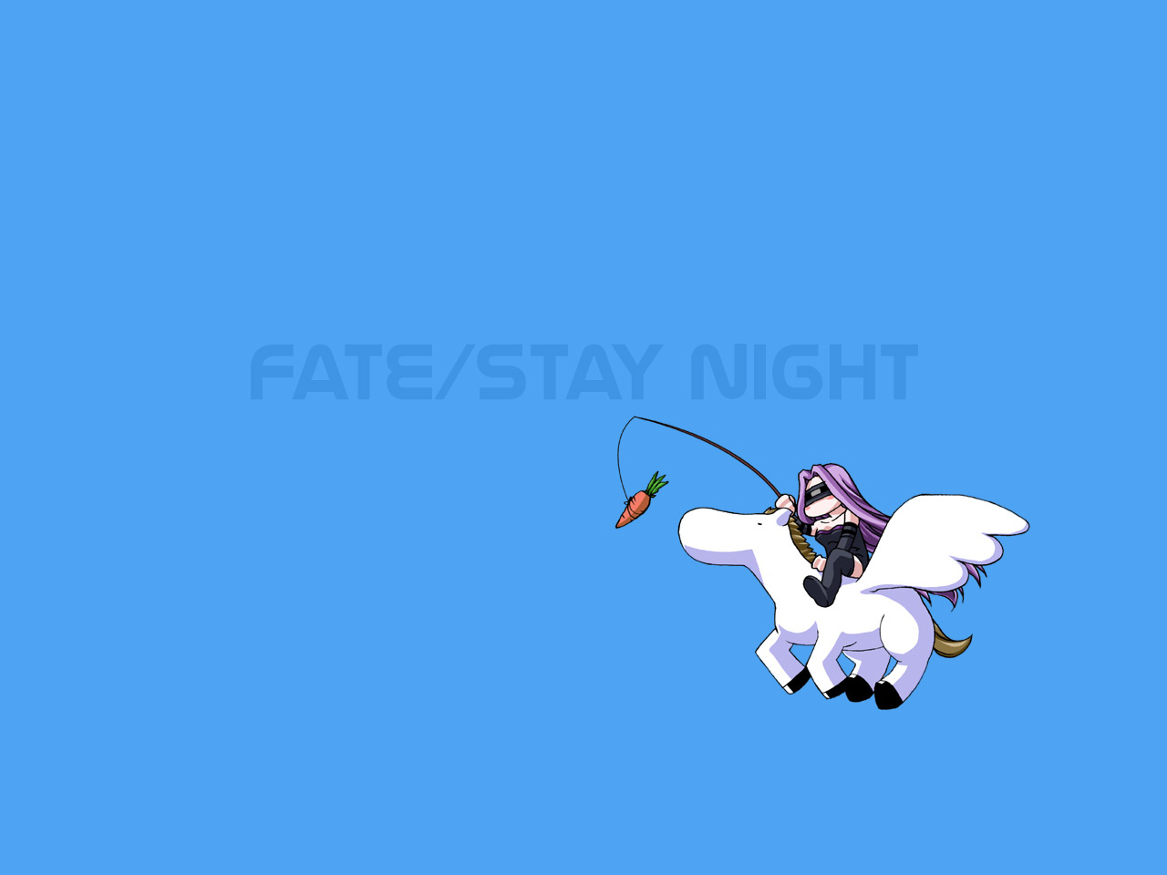Description: A cartoon character riding a white horse with a fish in its mouth and a caption that reads fat stay night.