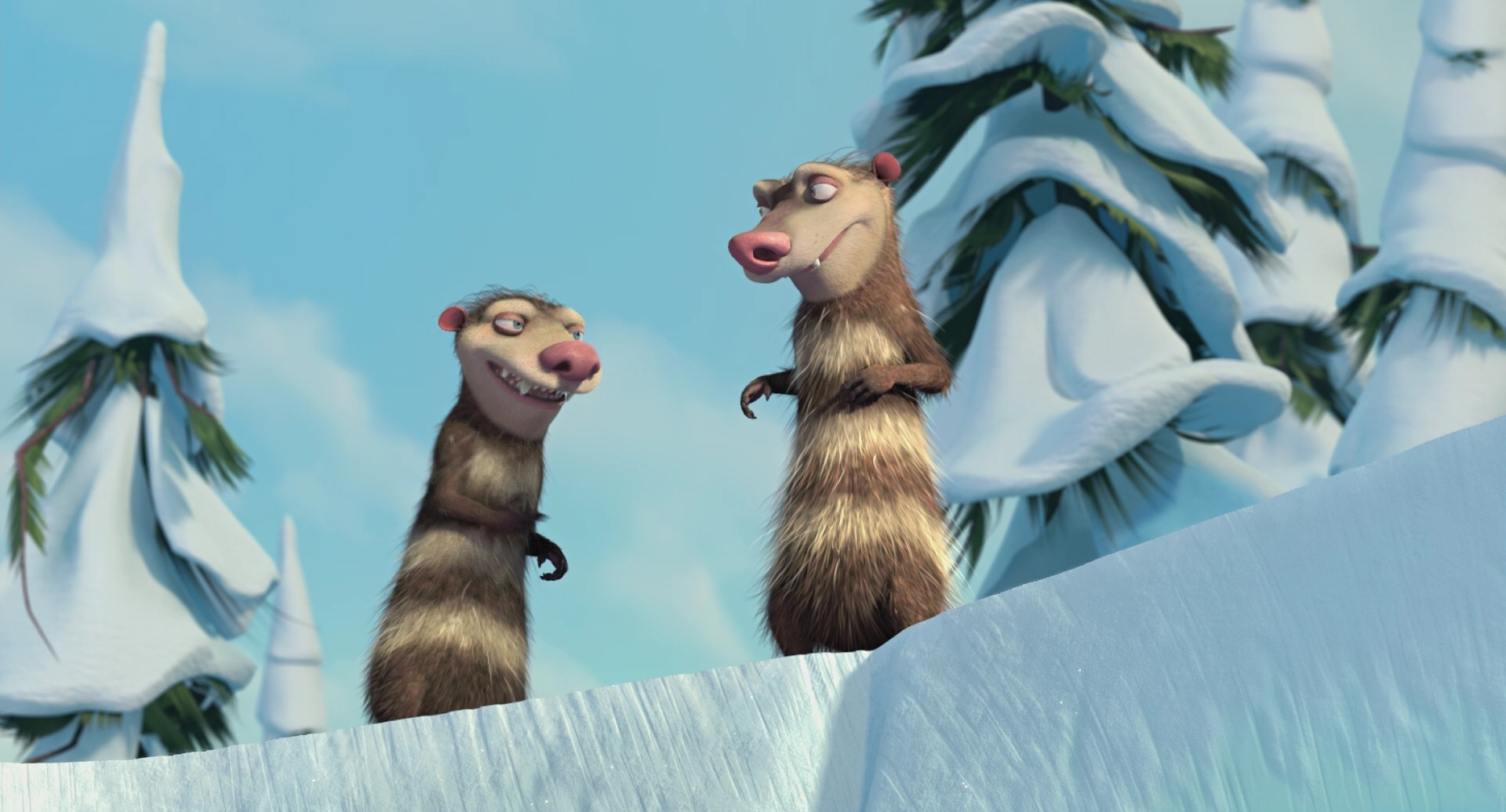 Description: A couple of cartoon animals standing on top of a snow covered hill in the snow with trees in the background.