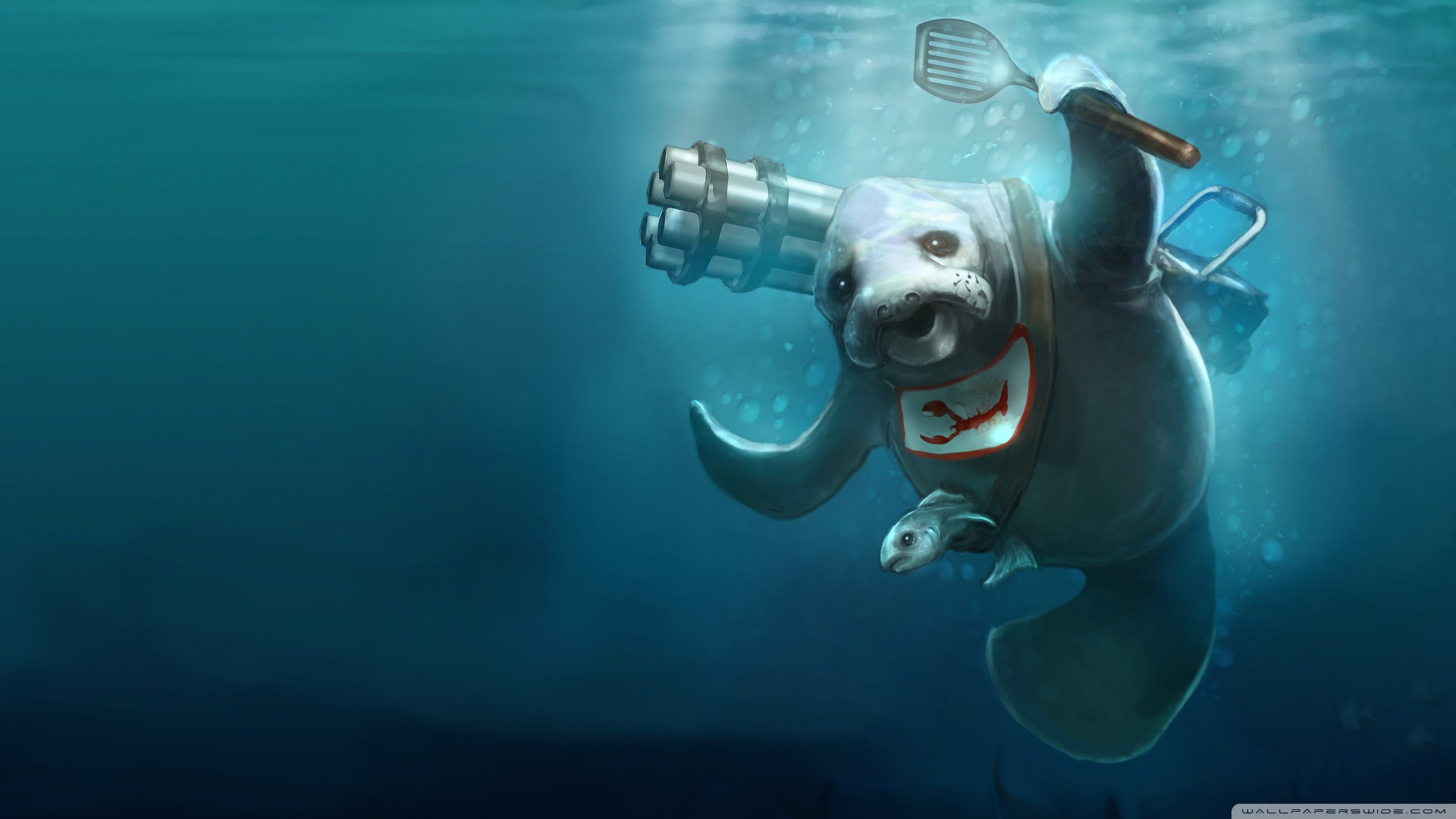 Description: A cartoon picture of a bear holding a spatula in the water with a grill in its mouth and a fish in its mouth.