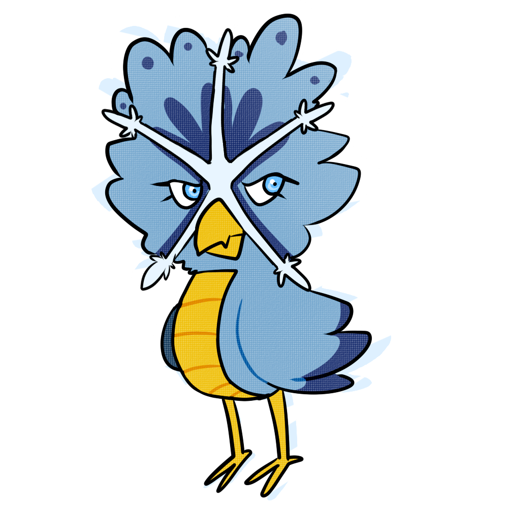 Description: A cartoon bird with a knife in its beak and a blue face with a yellow beak and a yellow beak.
