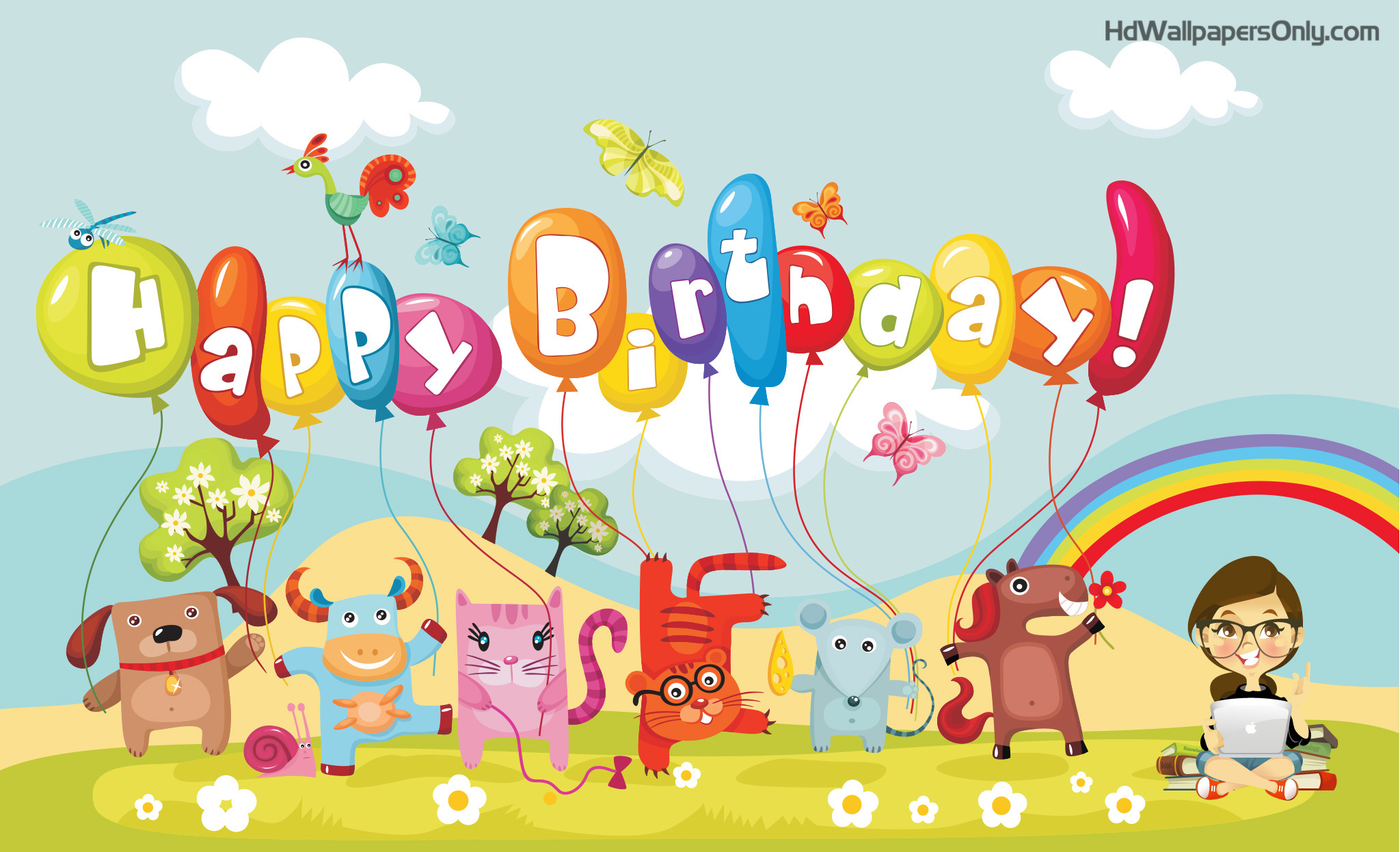 Description: A cartoon birthday card with a group of animals and balloons with a girl sitting on the ground in front of the balloons.