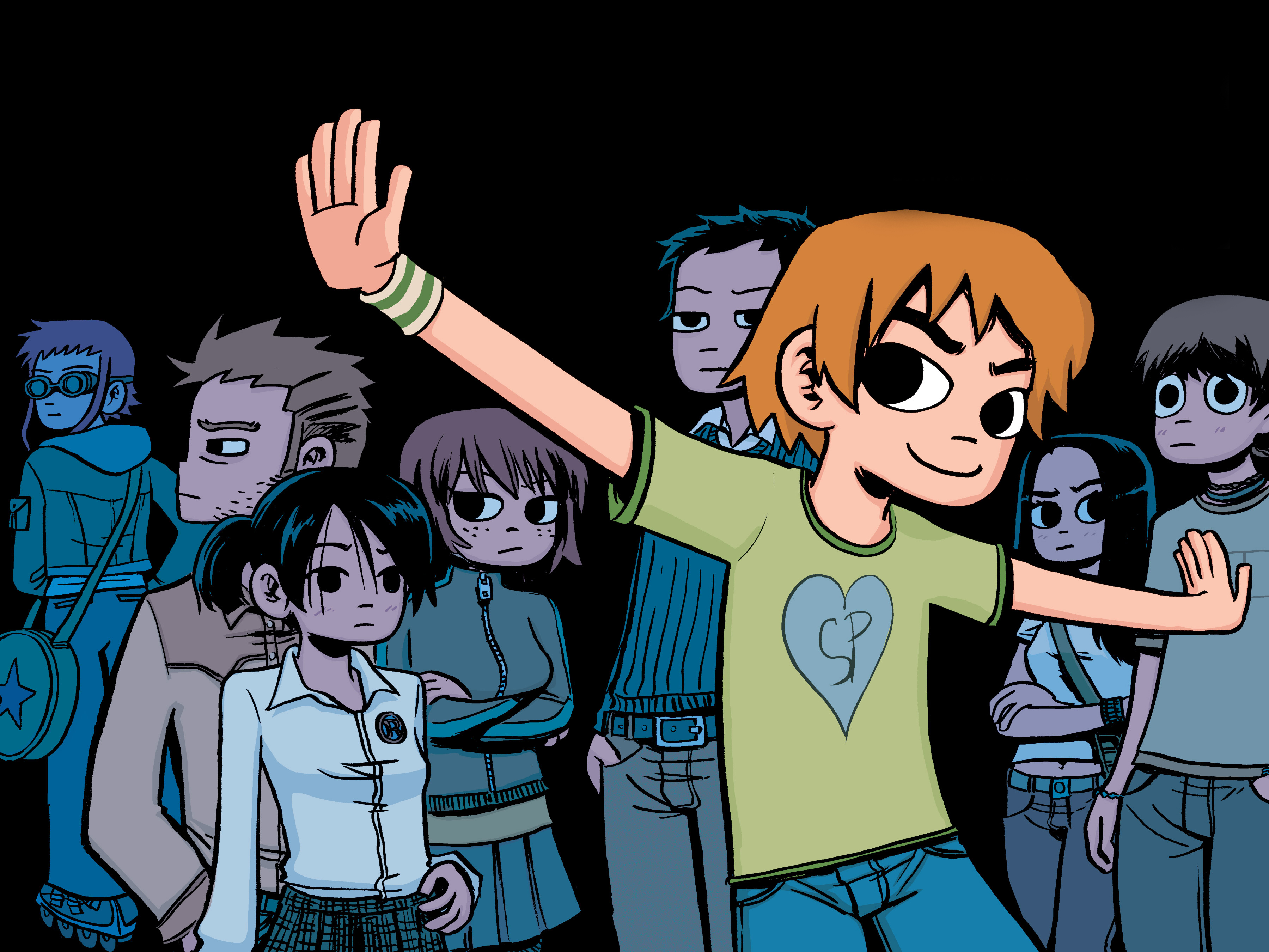 Description: A cartoon of a boy with his arms up in front of a group of people with their hands up.