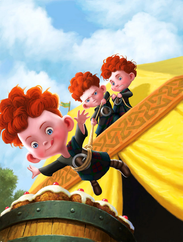 Description: A cartoon picture of a boy and a girl flying over a cake in a tent with a sky background.