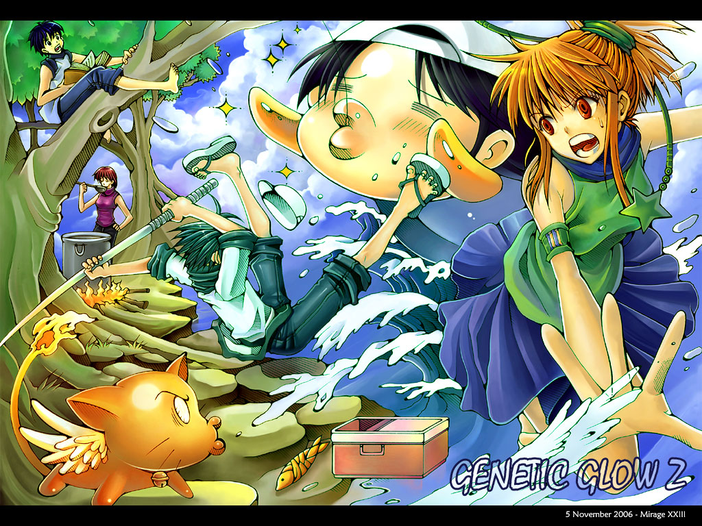 Description: A cartoon of a boy and a girl in a forest with a cat and a bird on the ground.