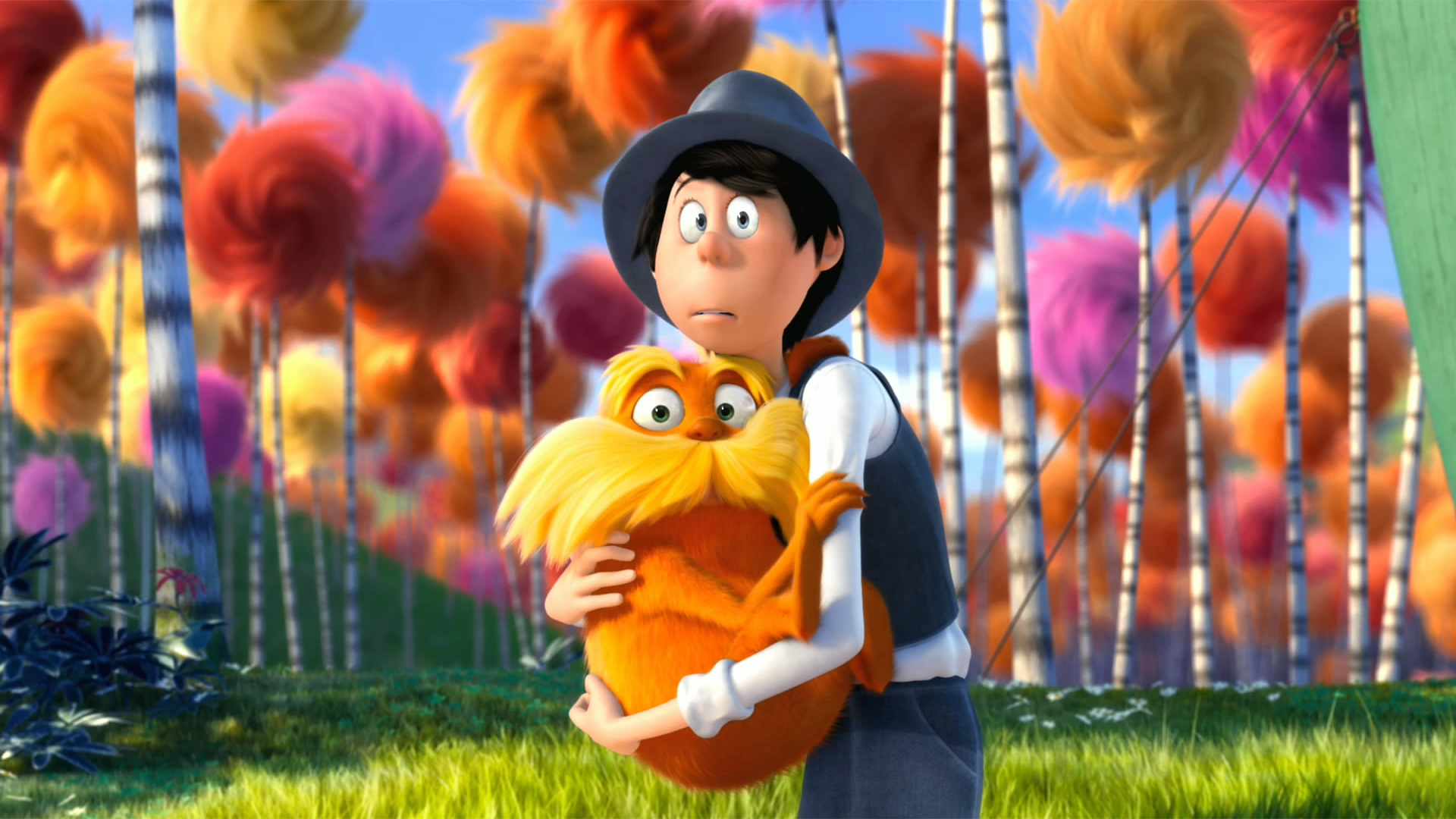 Description: A cartoon character holding a stuffed animal in a field of flowers and trees with a sky background of orange and yellow flowers.