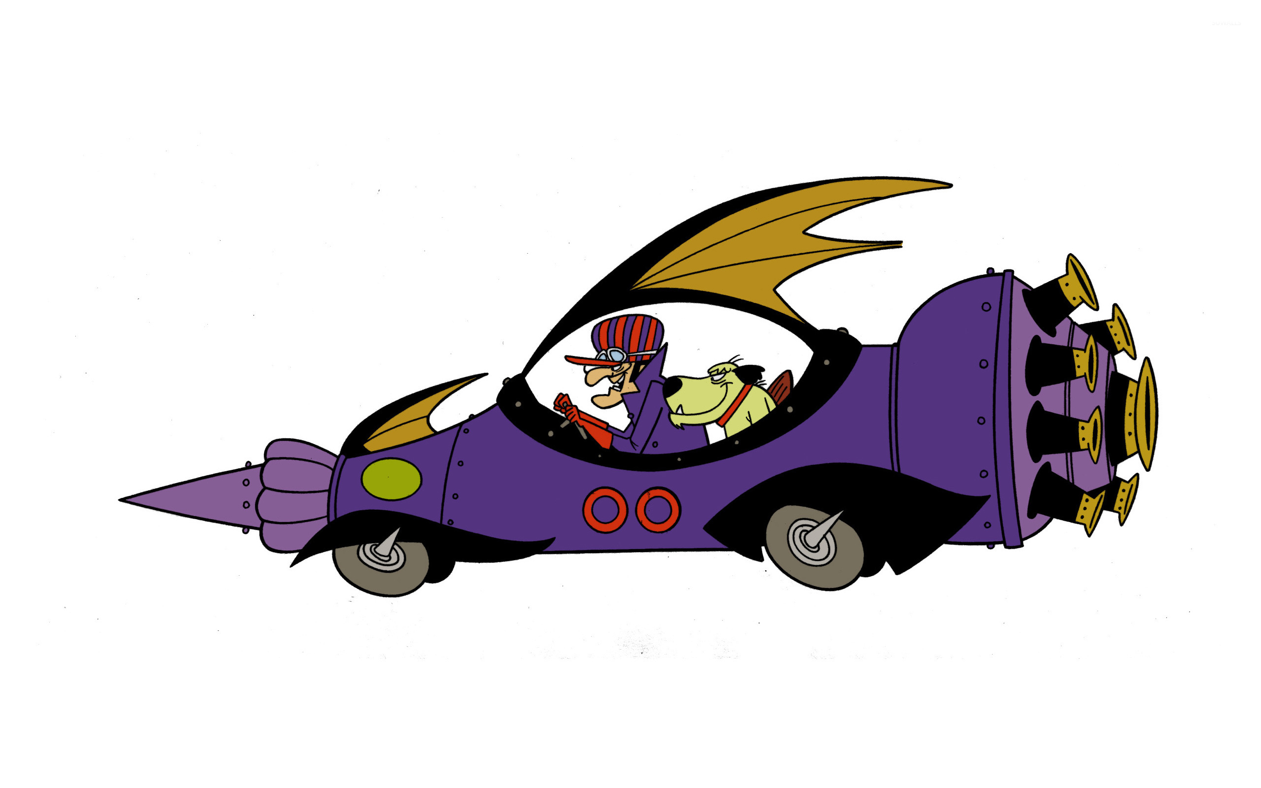 Description: A cartoon car with a man driving it with a dragon on the back of it's seat and a woman in the passenger seat.