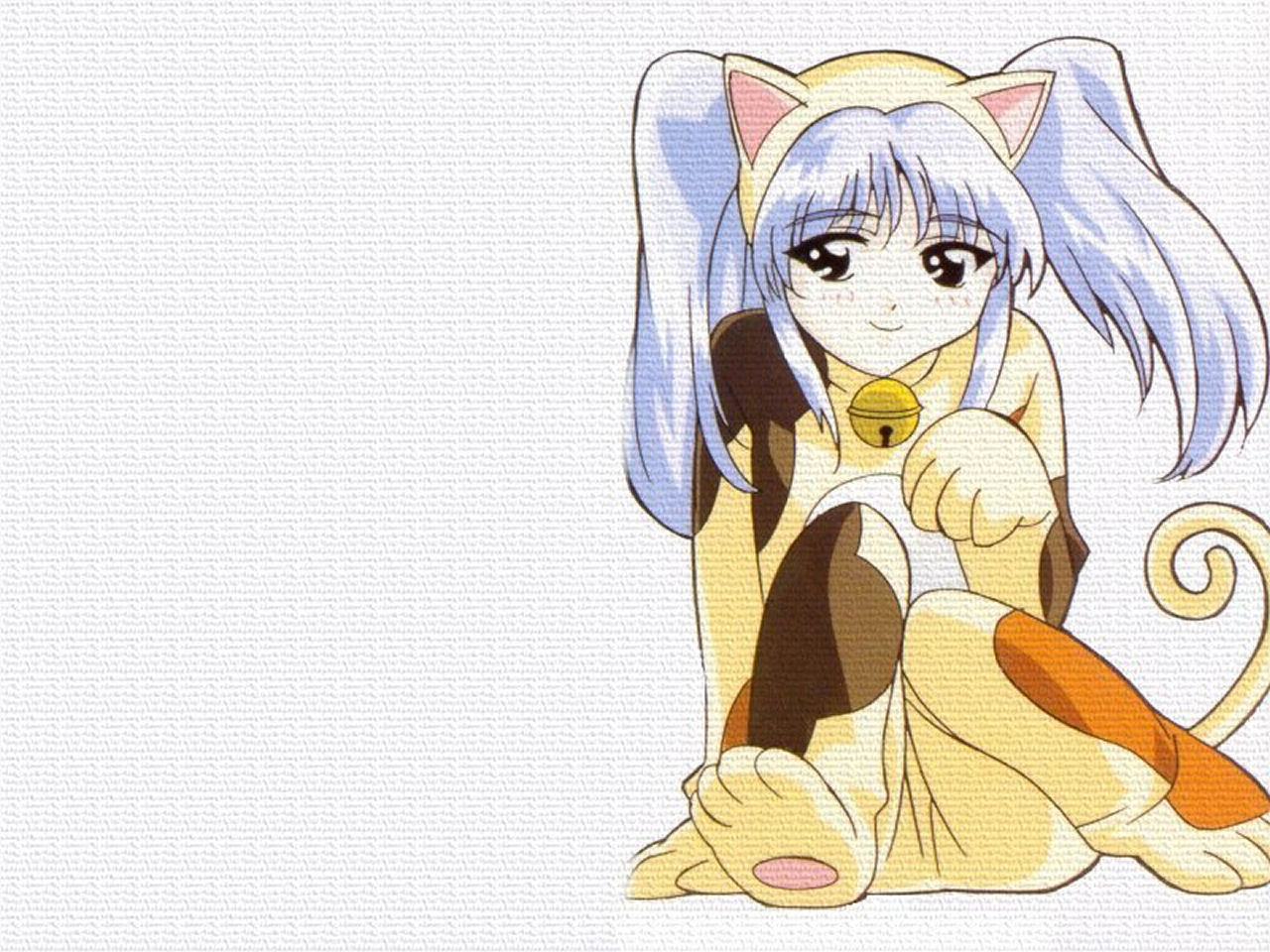 Description: A cartoon cat sitting on the ground with a bell in its mouth and a cat tail on its head.