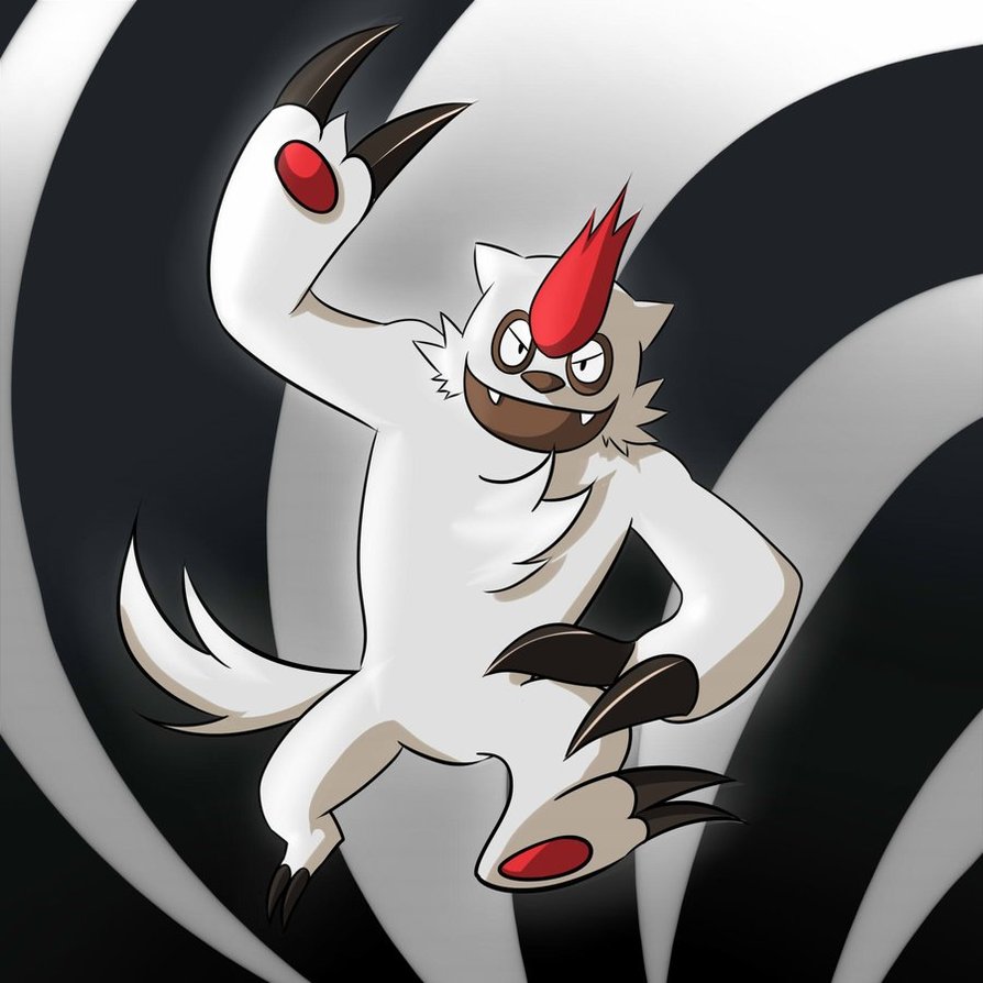 Description: A cartoon cat with a red mohawk on its head and a black and white background with a spiral design.