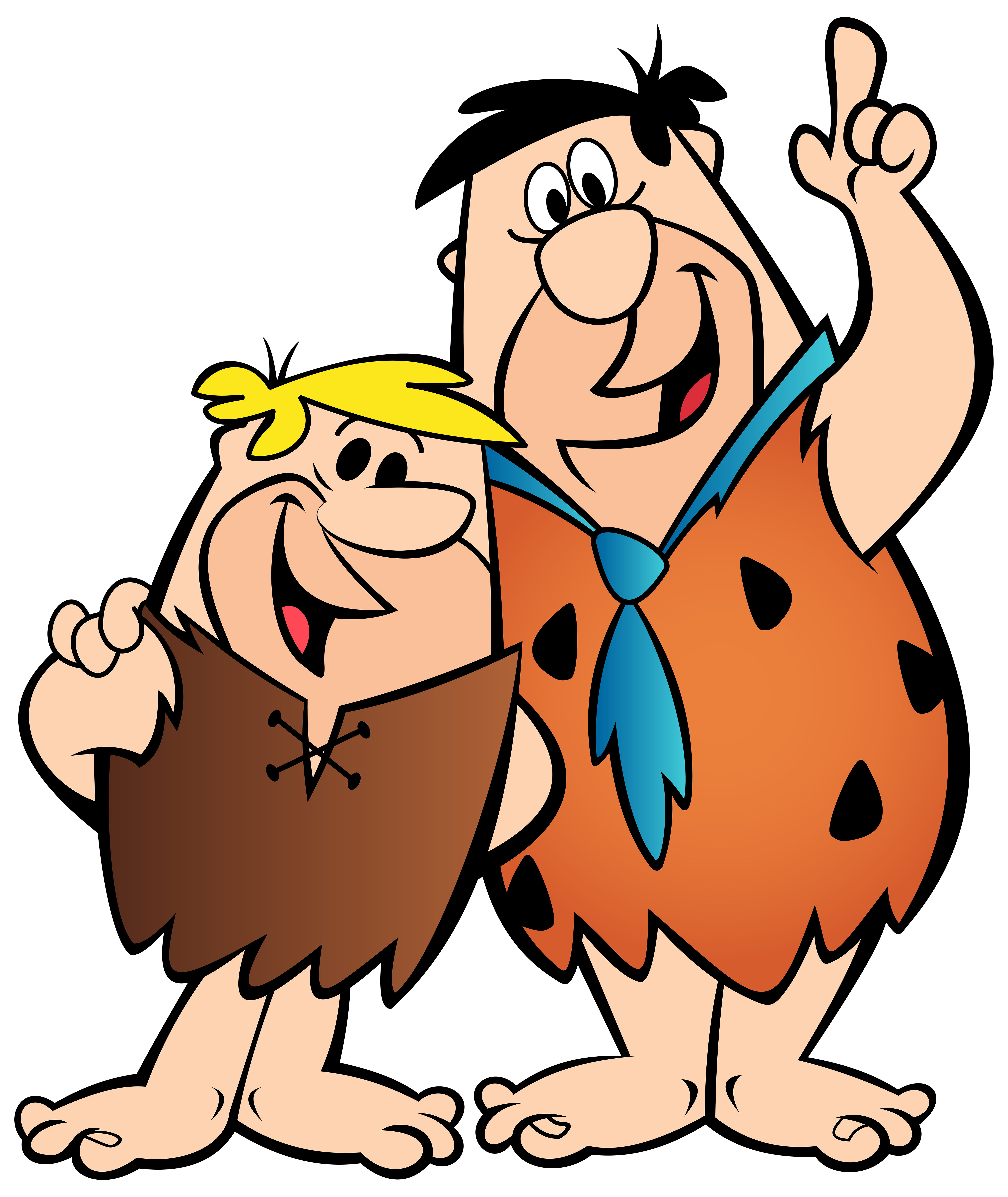 Description: A cartoon caveman and a cave boy are smiling and waving at each other while standing together.