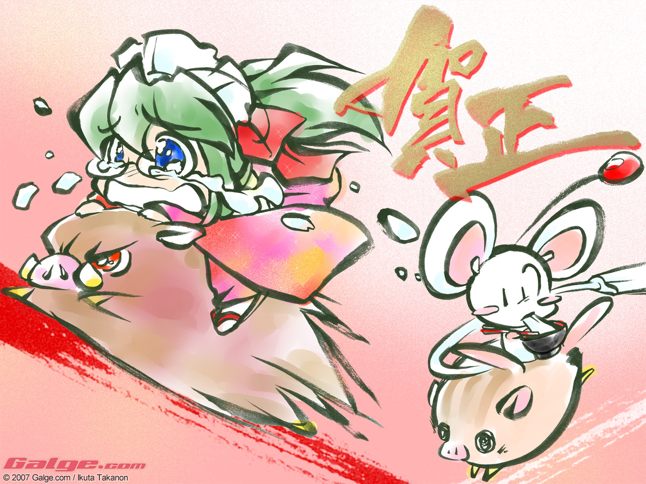 Description: A drawing of a cartoon character and a cartoon animal with chinese characters in the background and a pink background.