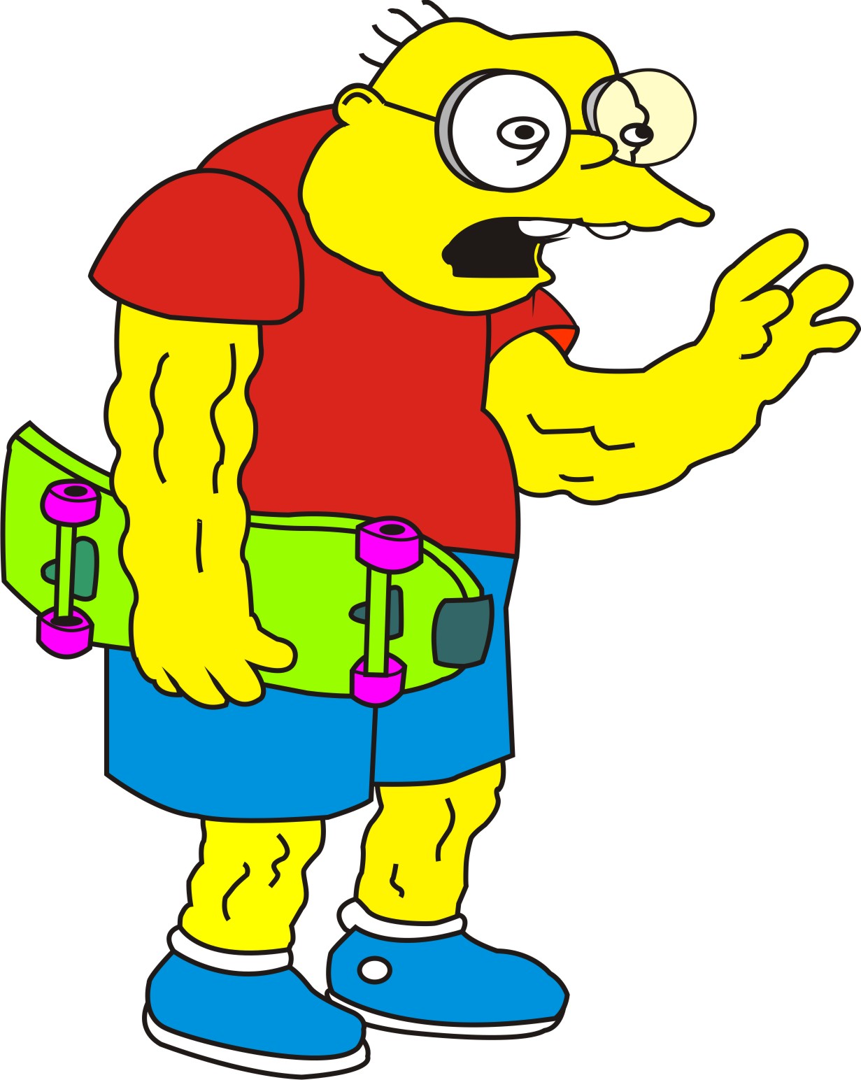 Description: A cartoon character with a backpack and a skateboard in his hand and a handbag in his other hand.