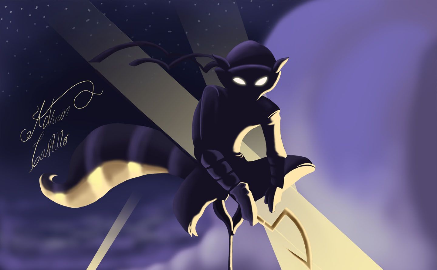 Description: A cartoon character with a bat on a purple background with a sky background and stars in the background with a message written below.