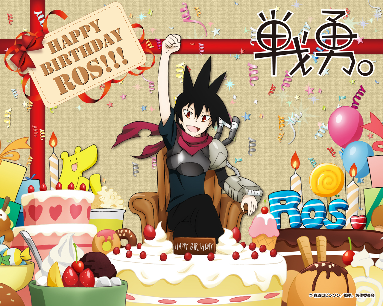 Description: A cartoon character sitting in a chair with a birthday cake in front of him and a happy birthday sign in the background.