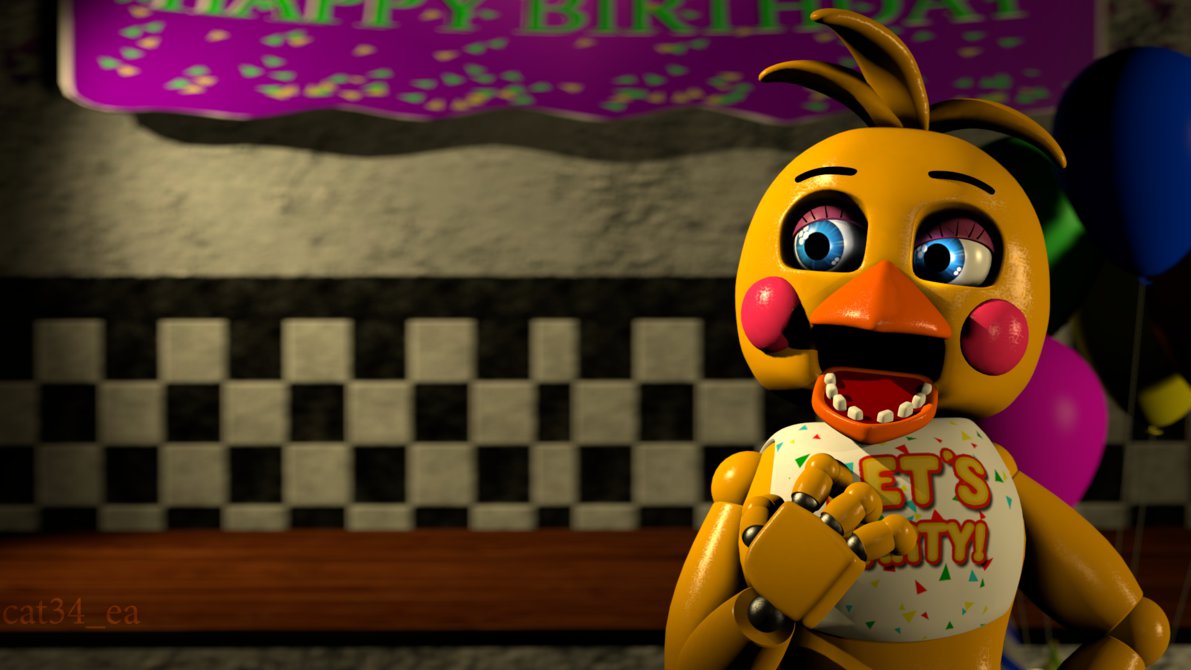 Description: A cartoon character is holding a birthday cake in front of a birthday cake sign and balloons in the background.