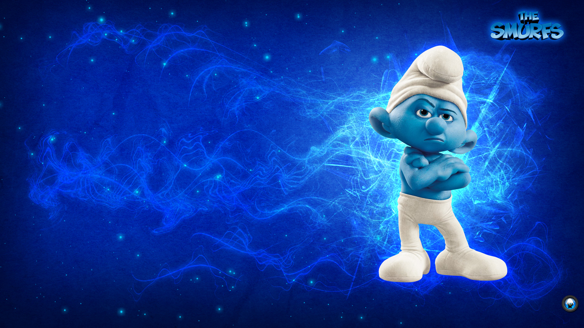 Description: A cartoon character is standing in front of a blue background with stars and lines on it.